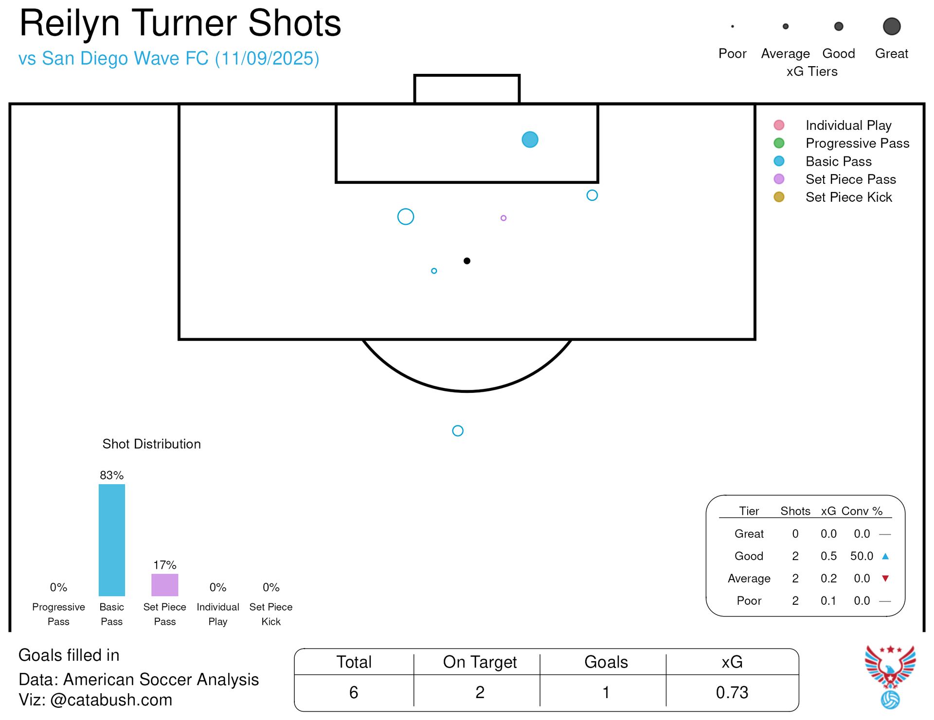 In this game she took six shots that added up to .73 xG, two were good enough to register on the good/great shot scale, and highest value effort was the match winner.