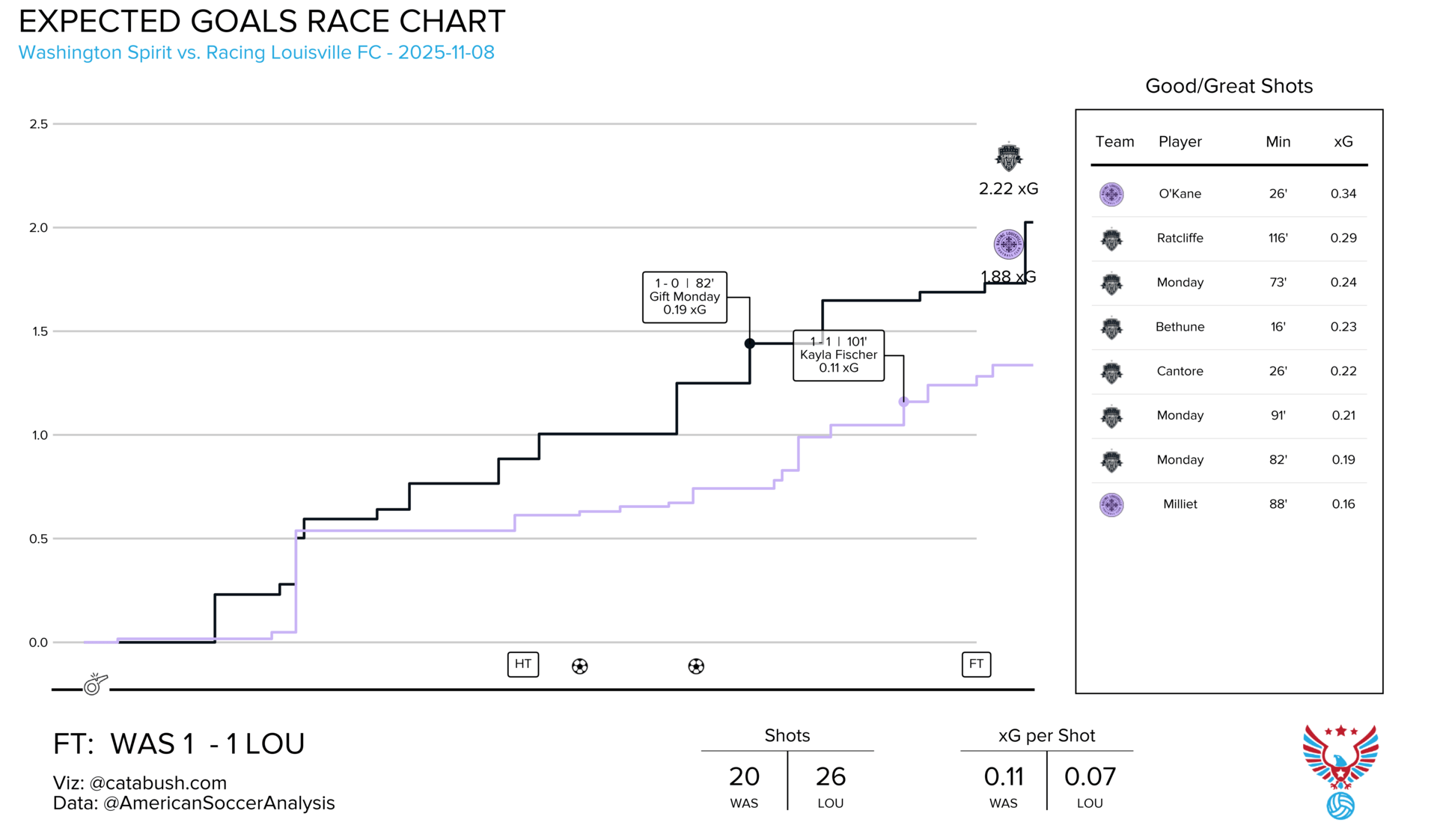 #Loovull, on the other hand, had two solid opportunities to execute an Ocean’s 11 style smash and grab. Katie O’Kane took the highest value shot of the game, but missed. While not listed, Emma Sears’ 101'st minute outside of the box curler was only .04, but a goal she’s scored before, and exactly the sort of thing the Spirit spent 100 minutes trying to avoid.