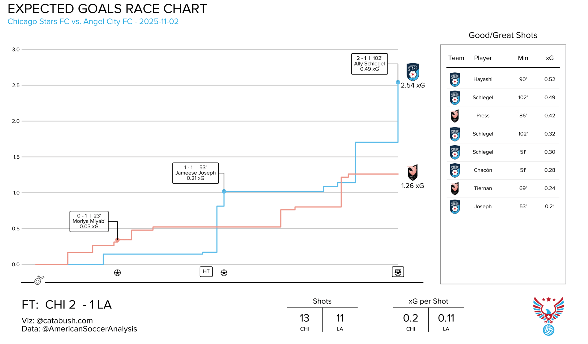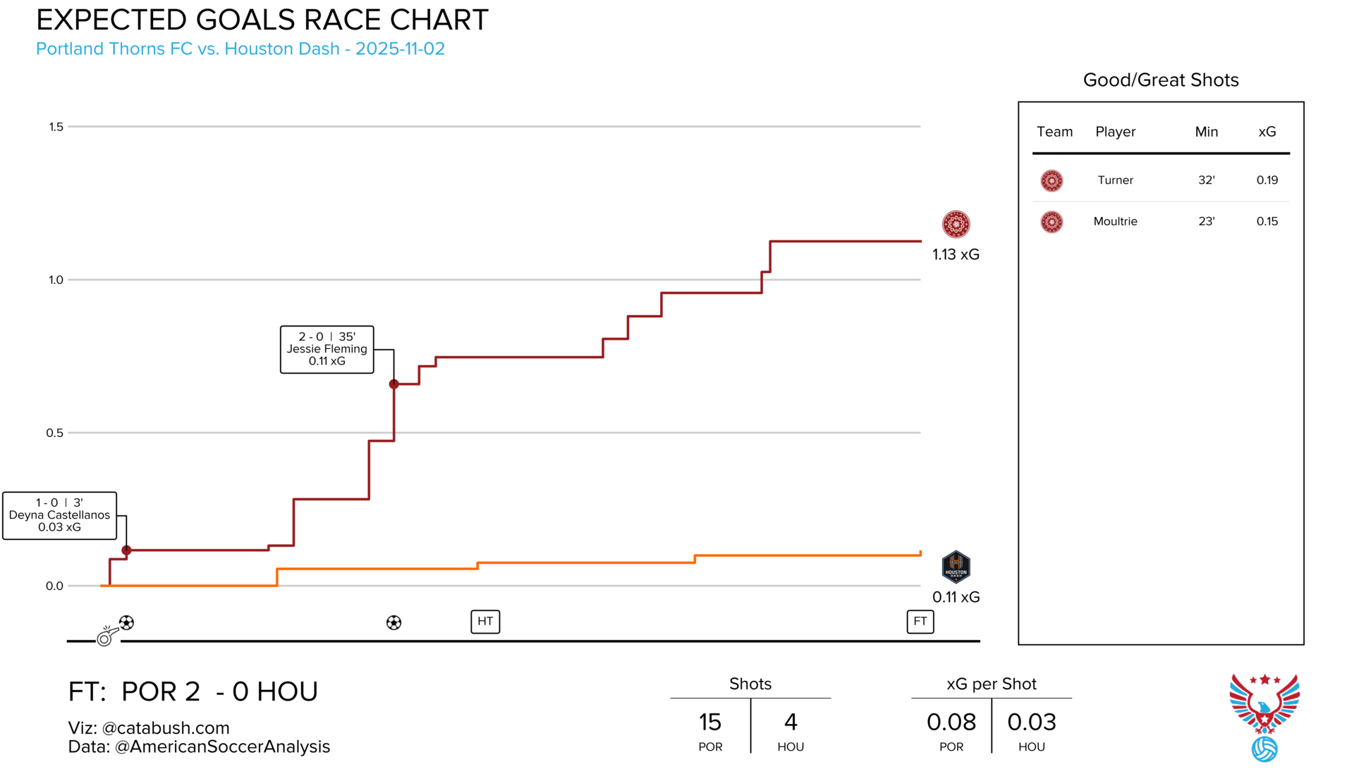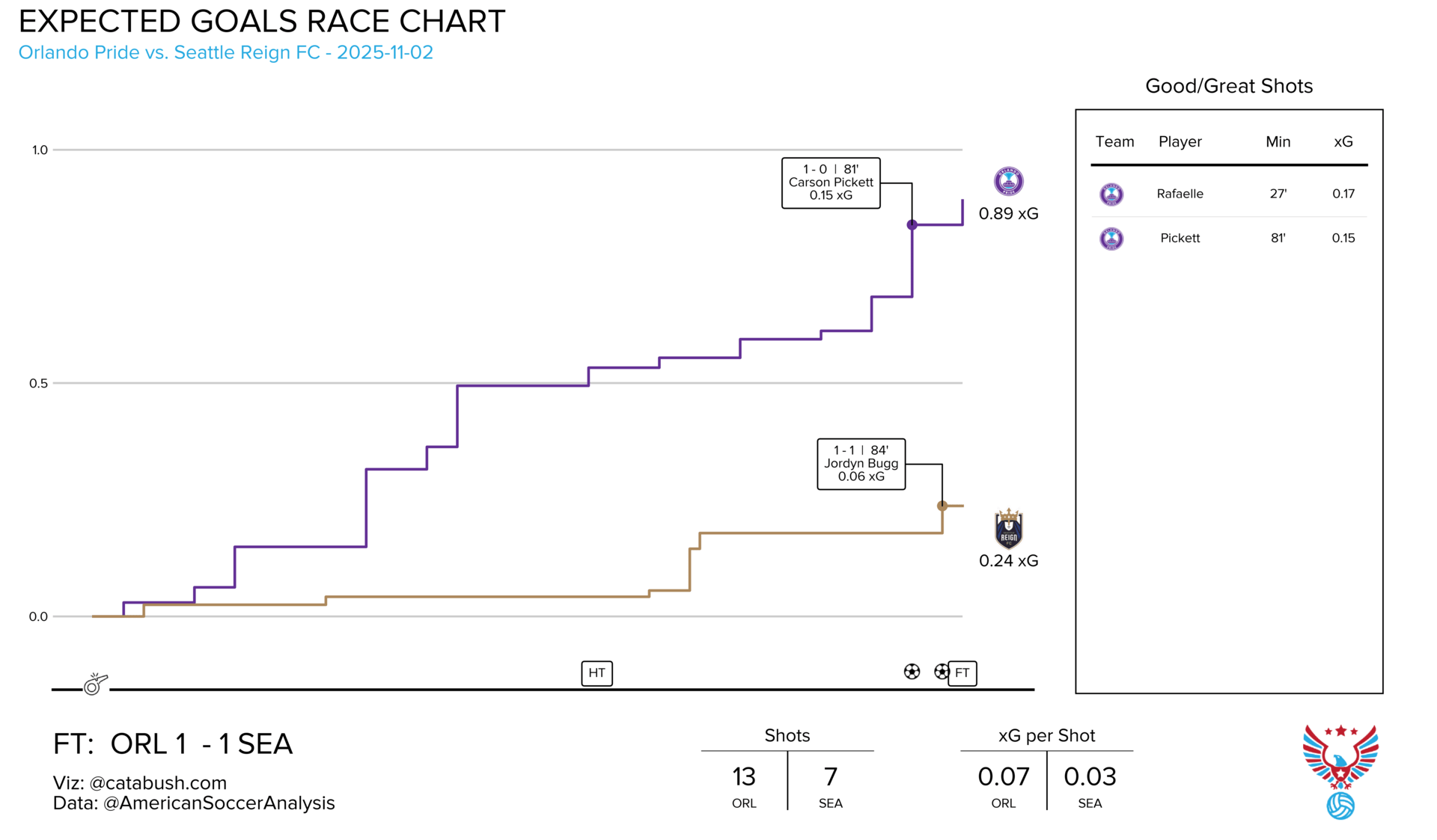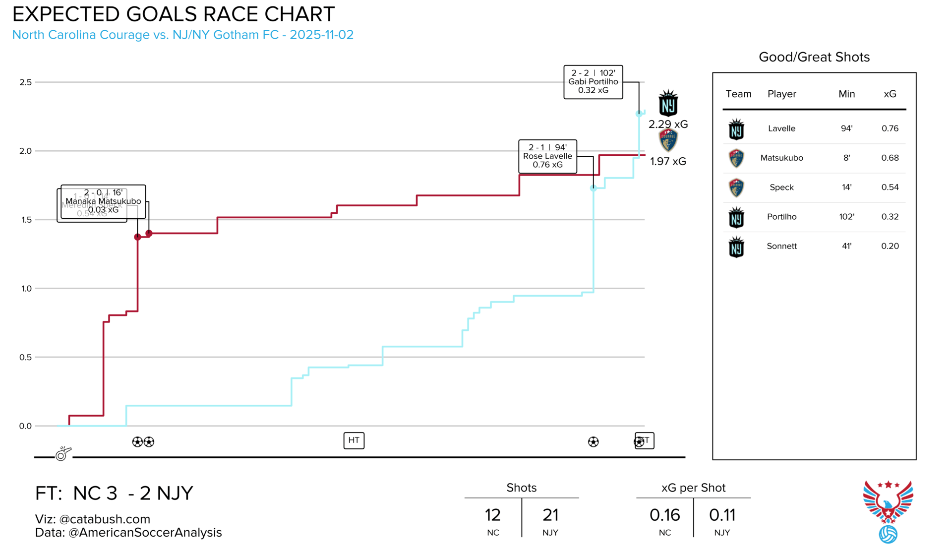 This was the surprise result of the weekend and it’s unfortunate that it didn’t matter much in the end. Also, 3-2 is a scoreline that flatters Gotham, the same way Lavelle’s pen (.76 xG) flatters their 2.29 total xG. North Carolina cooked and should have had more goals. The Bats woke up late to make the match appear far more respectable than it was, but I seent it with mine own eyes — that was stinky from Gotham.