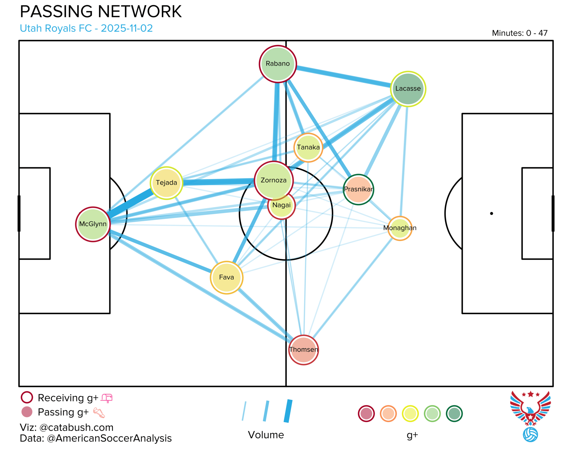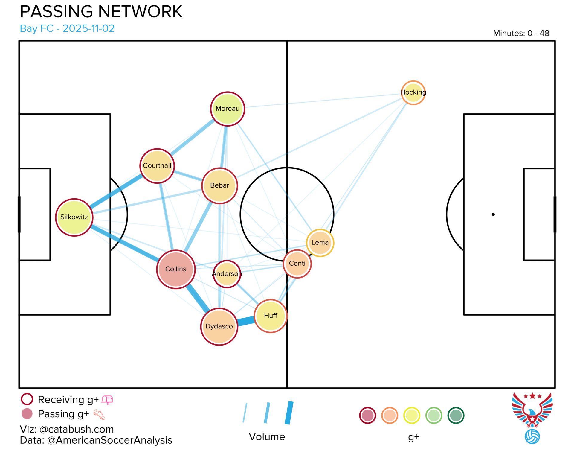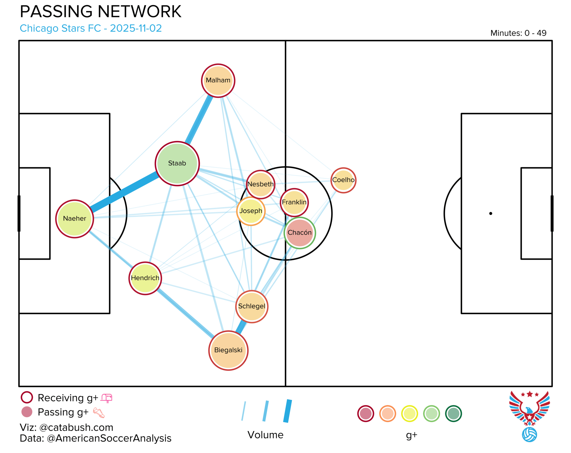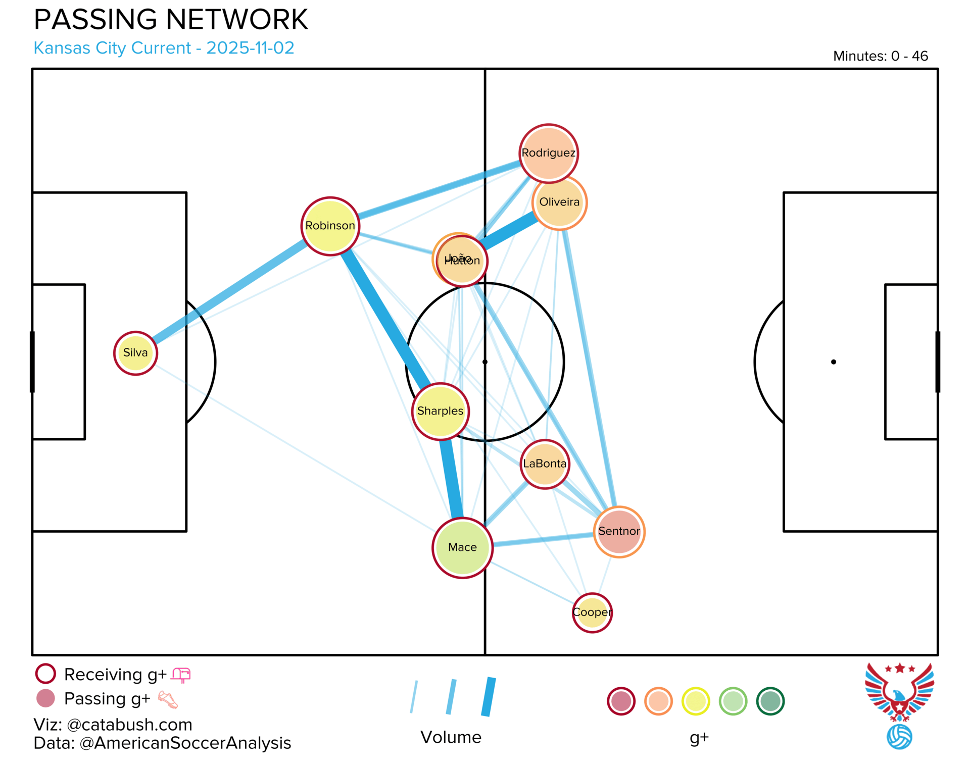 This represents the first half and shows how much goals and game state can alter a match. The Current never put up a passing network that looks like this. There is literally no one making passes from the center of the pitch. Oof.
