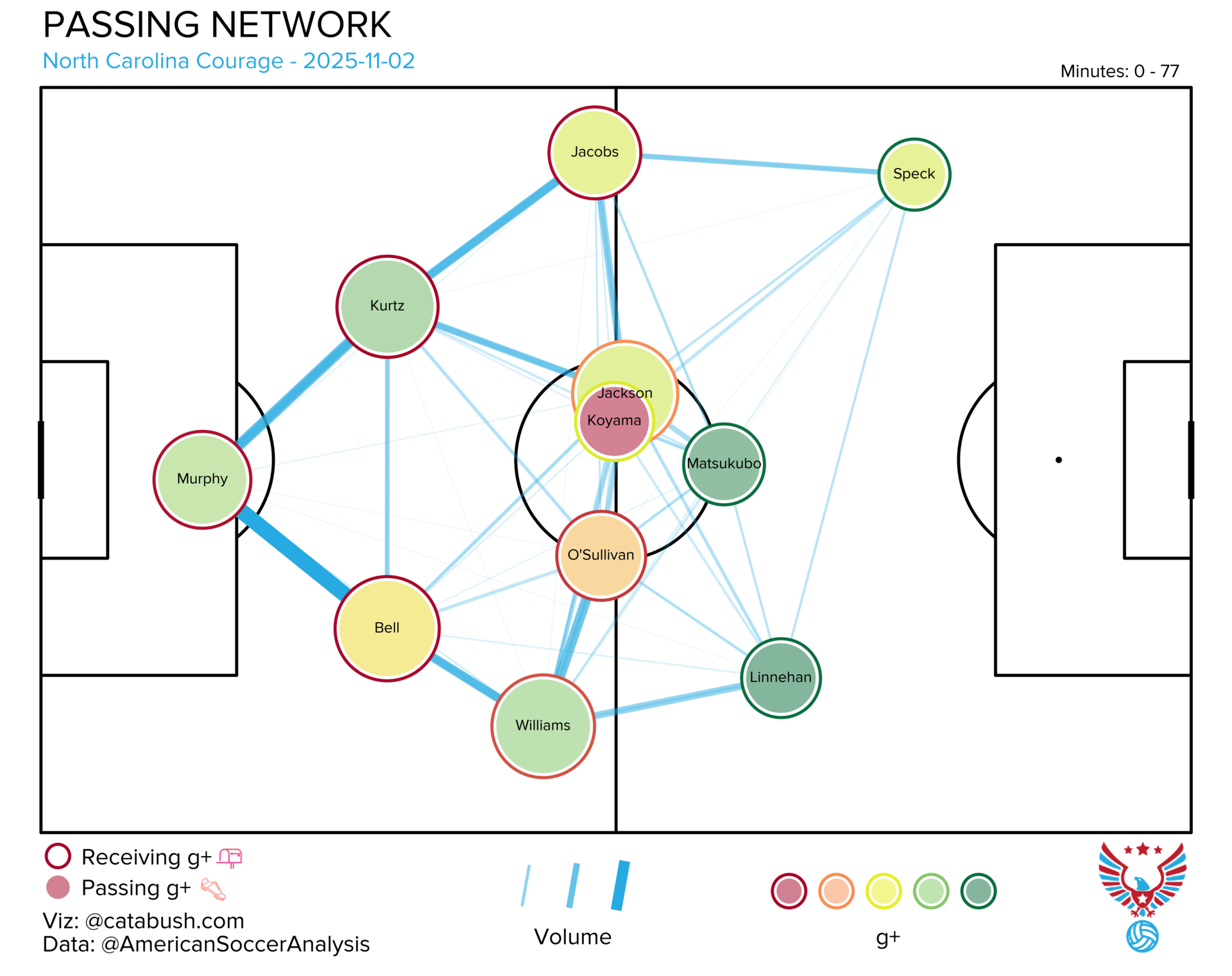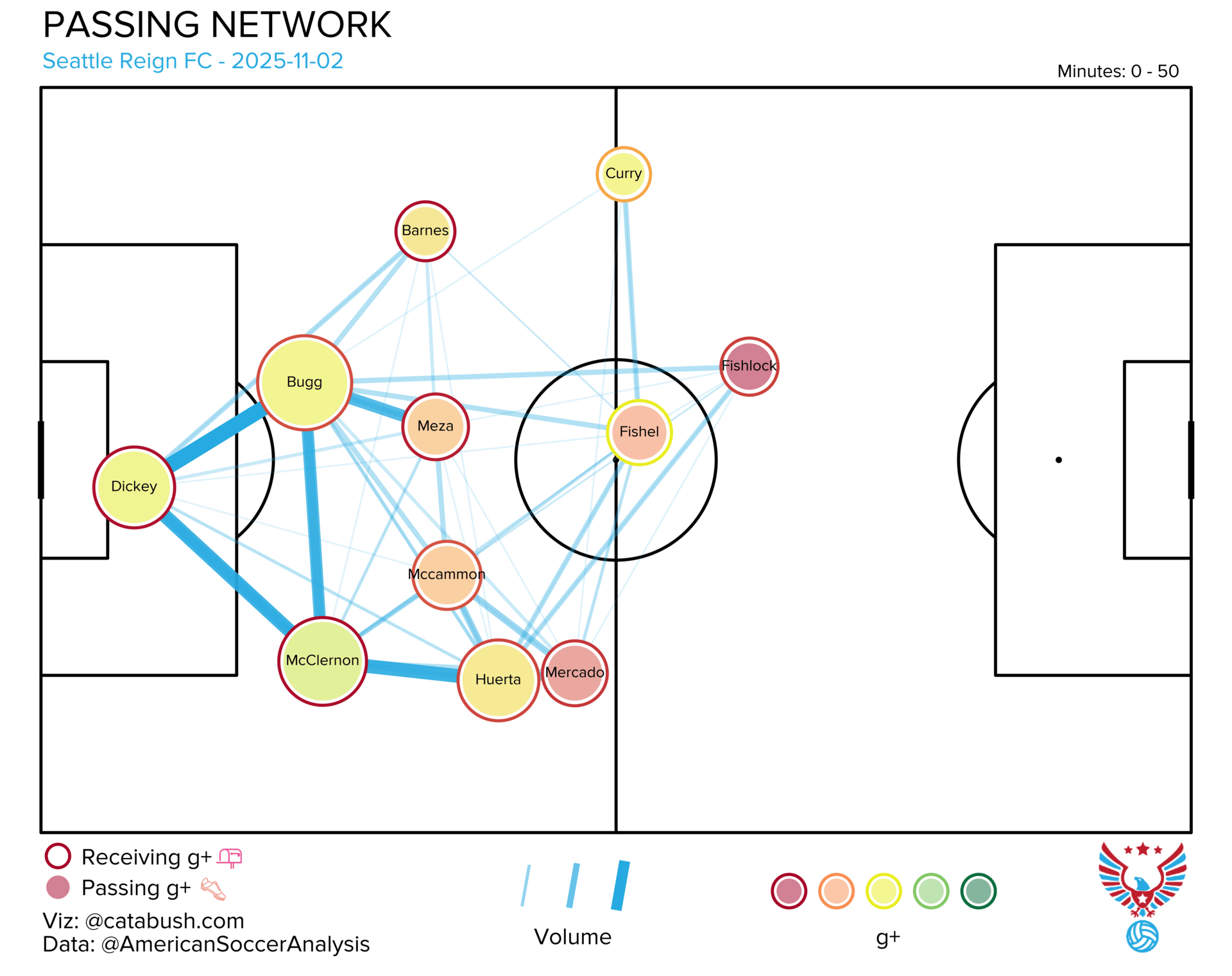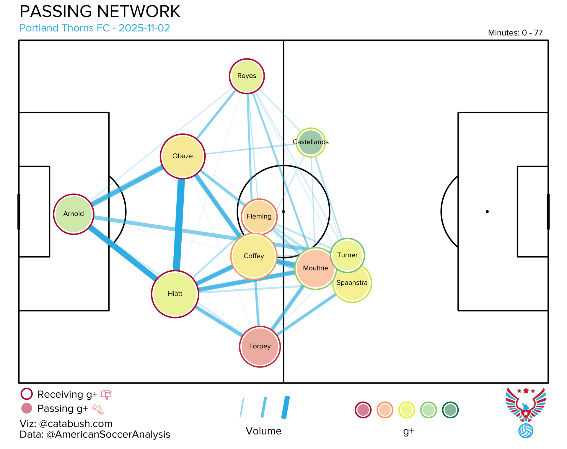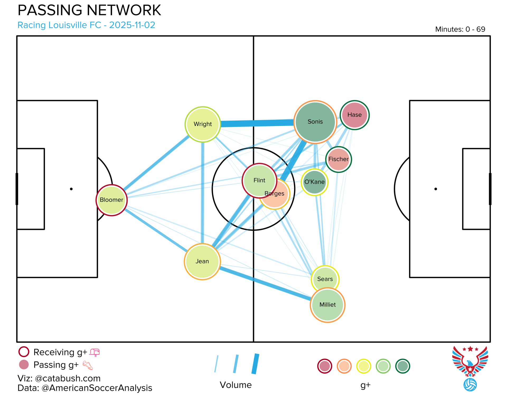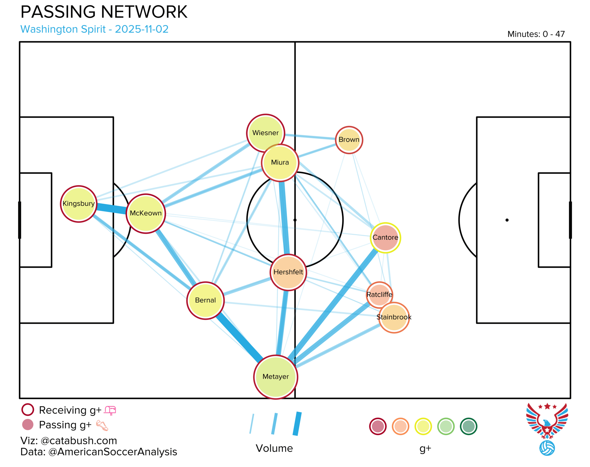 This represents the first half and shows how much goals and game state can alter a match. The Current never put up a passing network that looks like this. There is literally no one making passes from the center of the pitch. Oof.