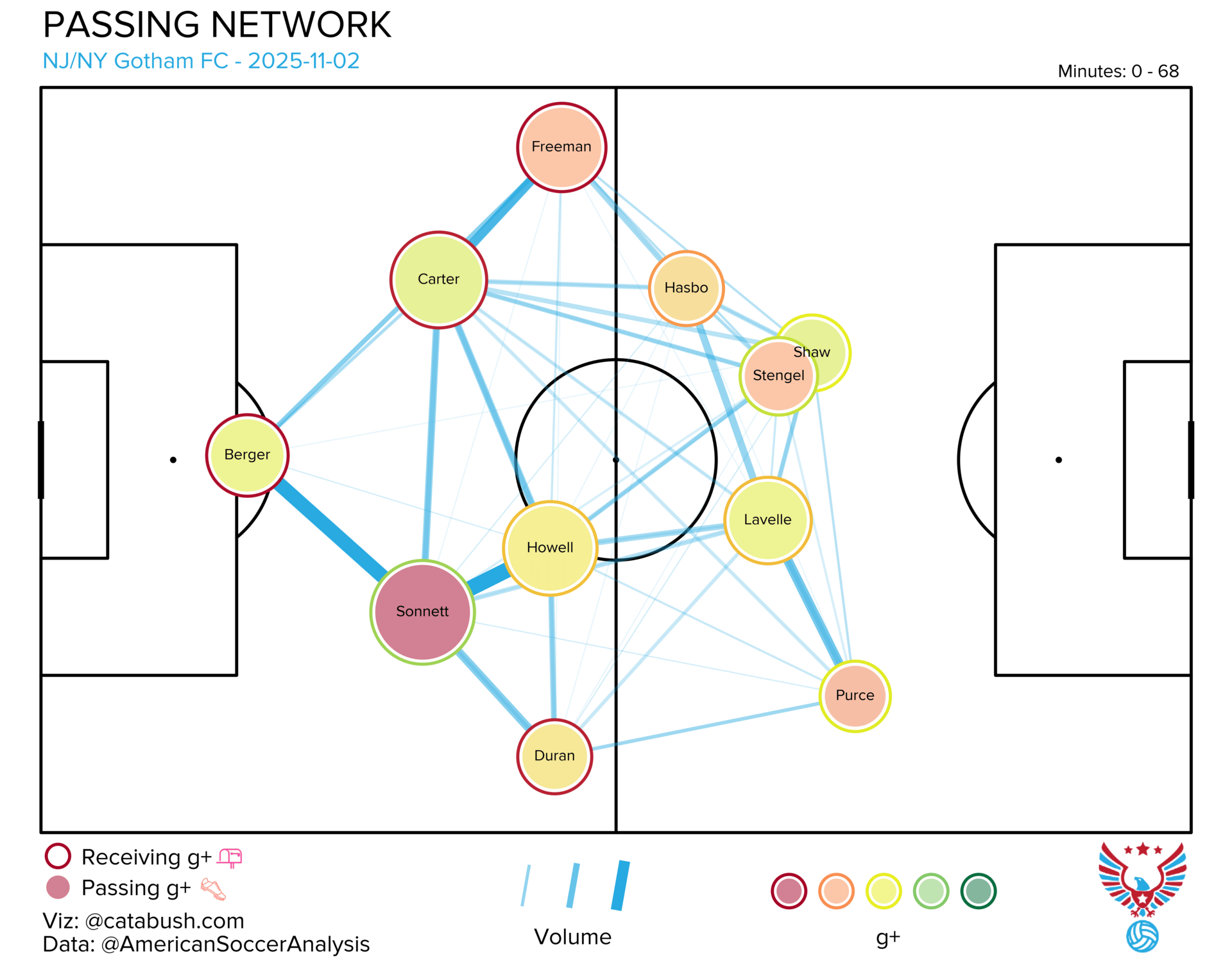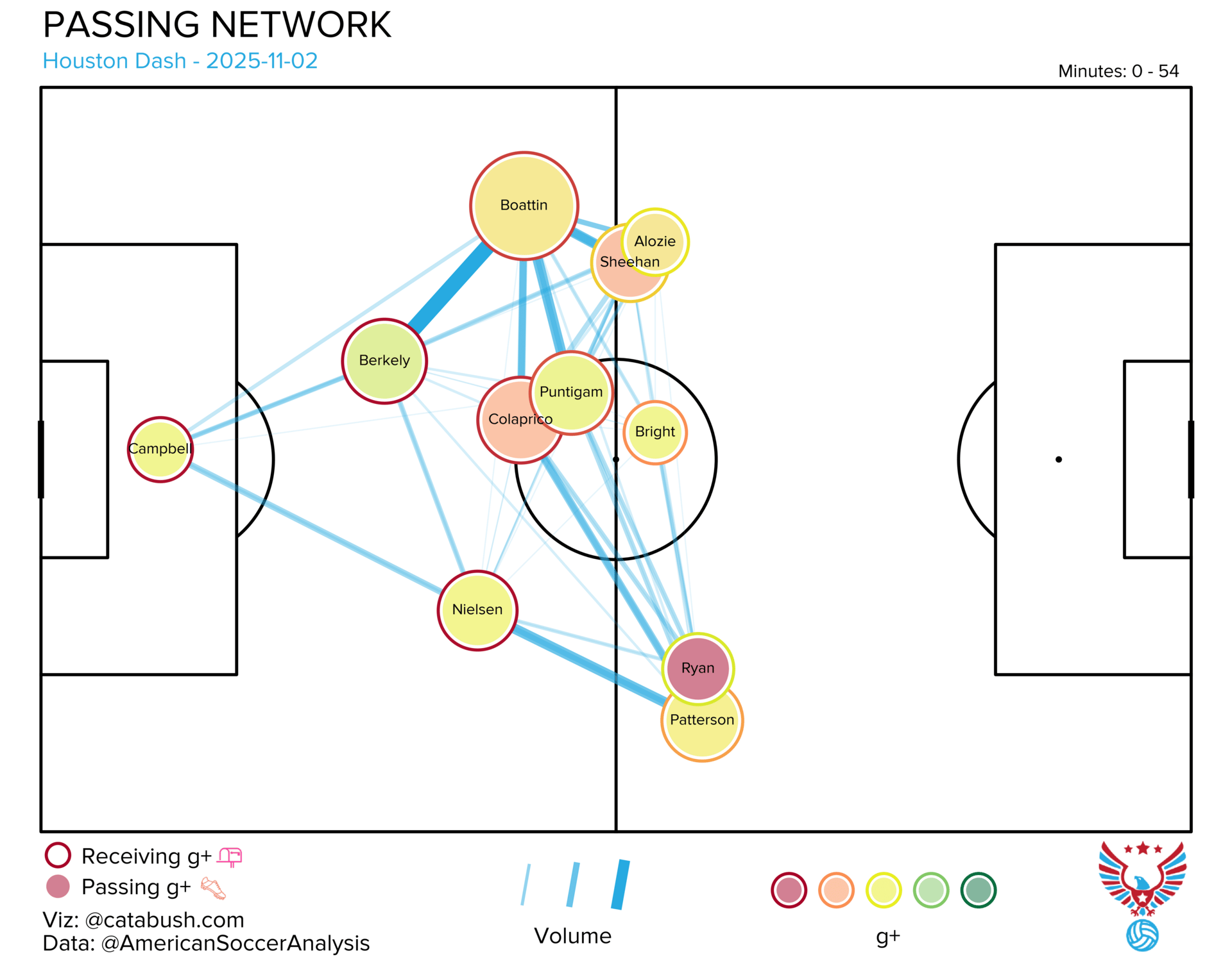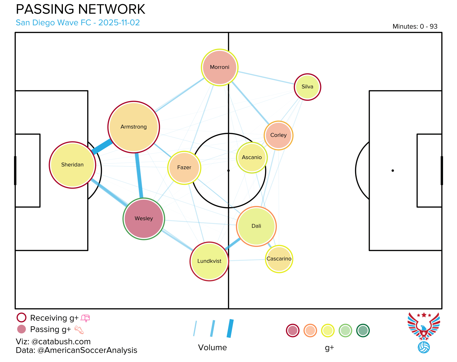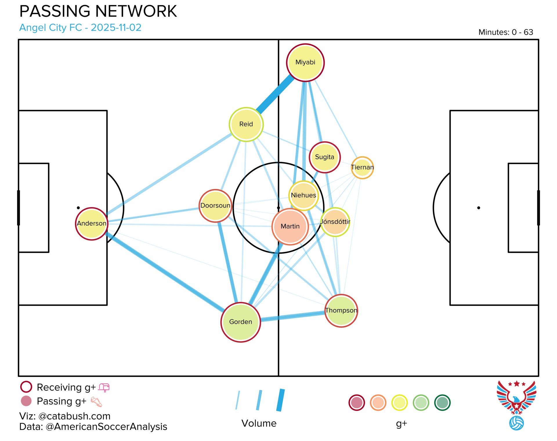 This represents the first half and shows how much goals and game state can alter a match. The Current never put up a passing network that looks like this. There is literally no one making passes from the center of the pitch. Oof.