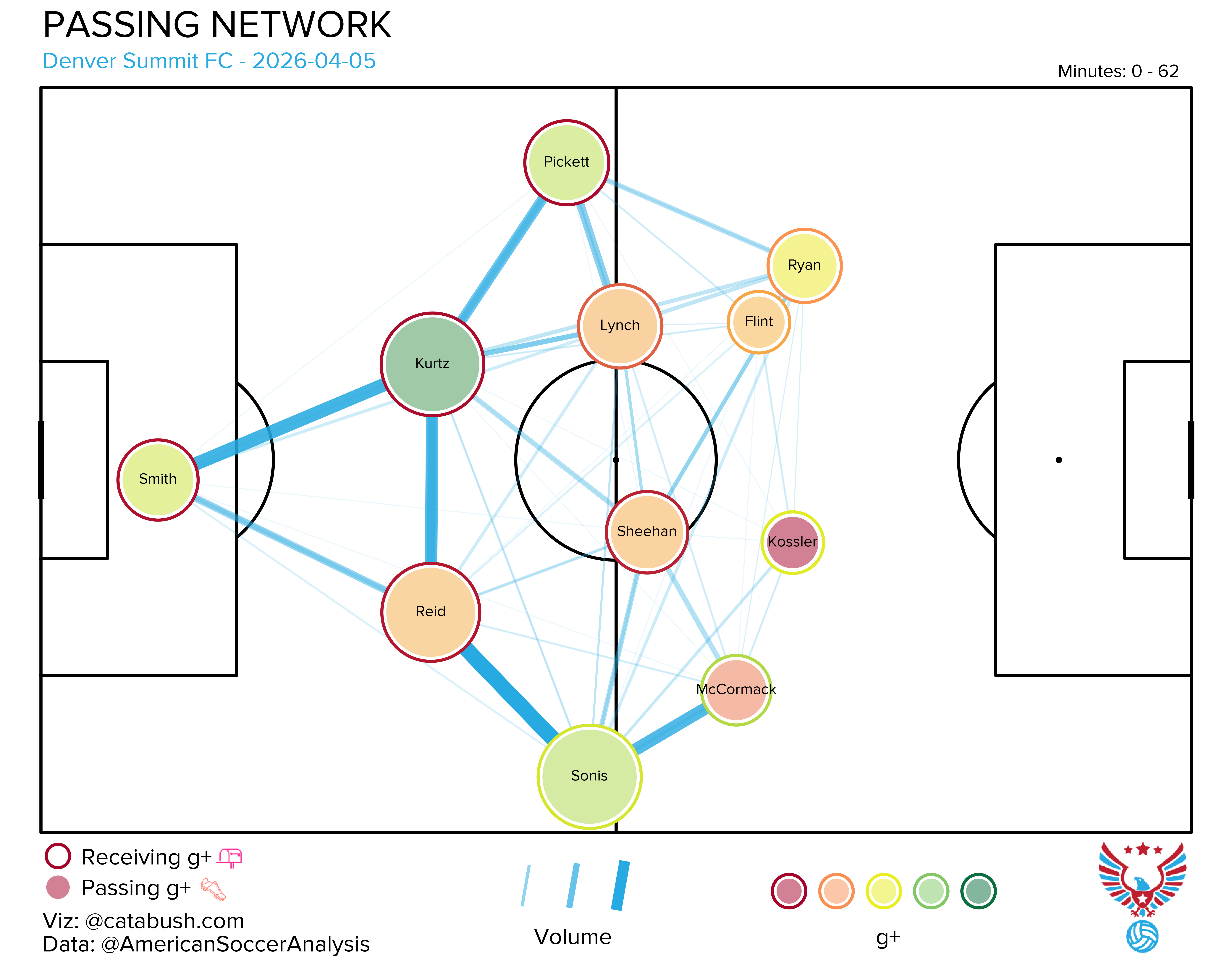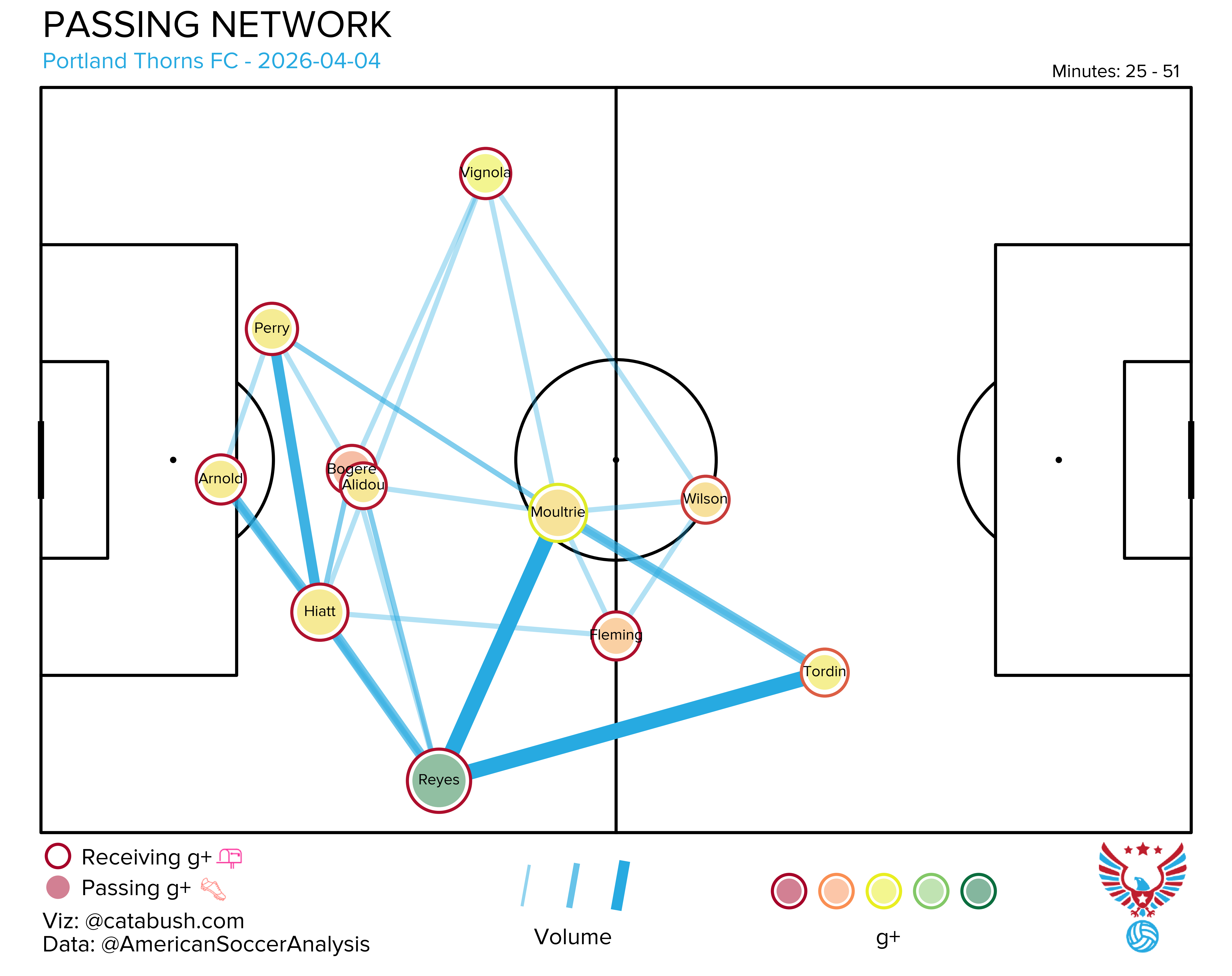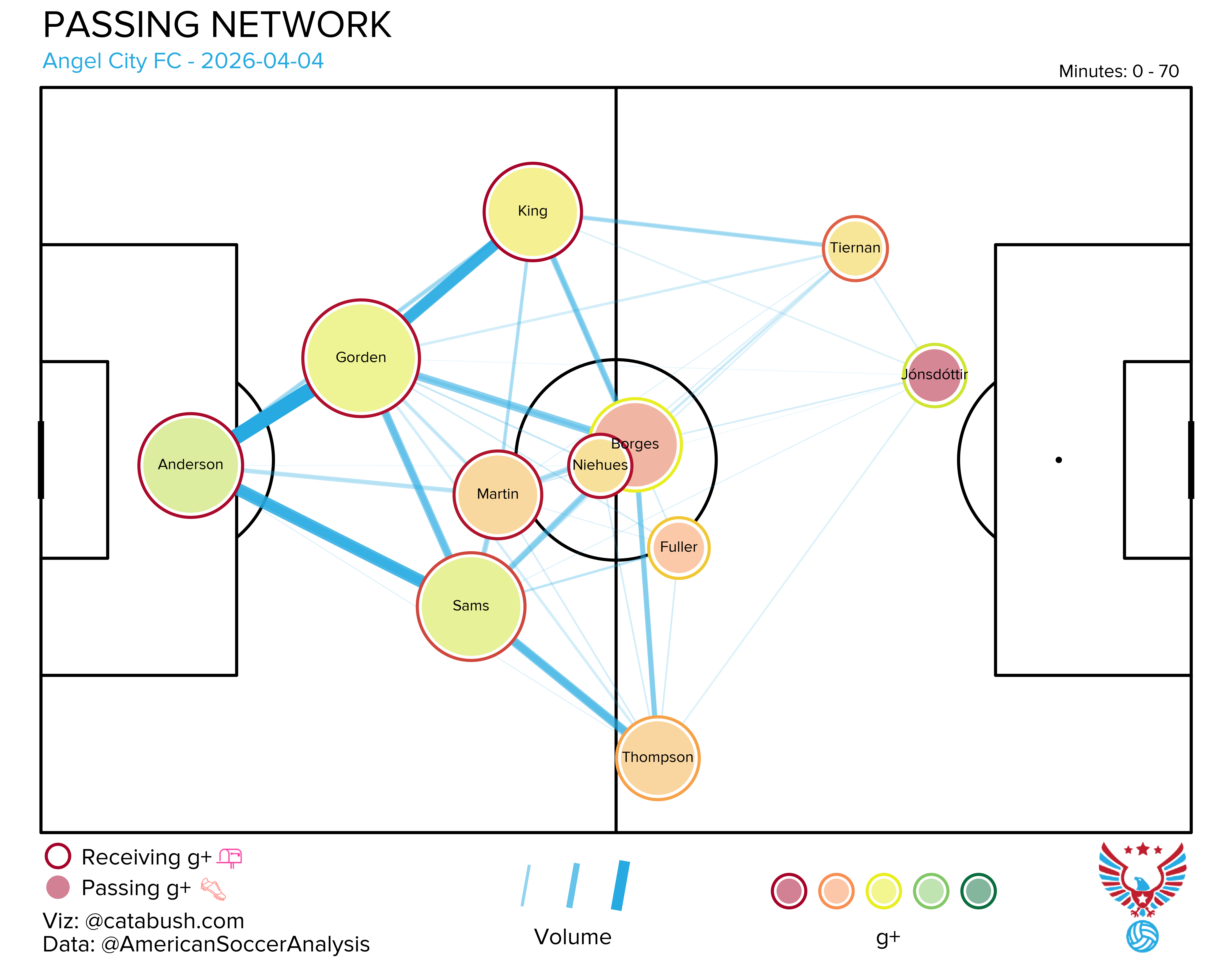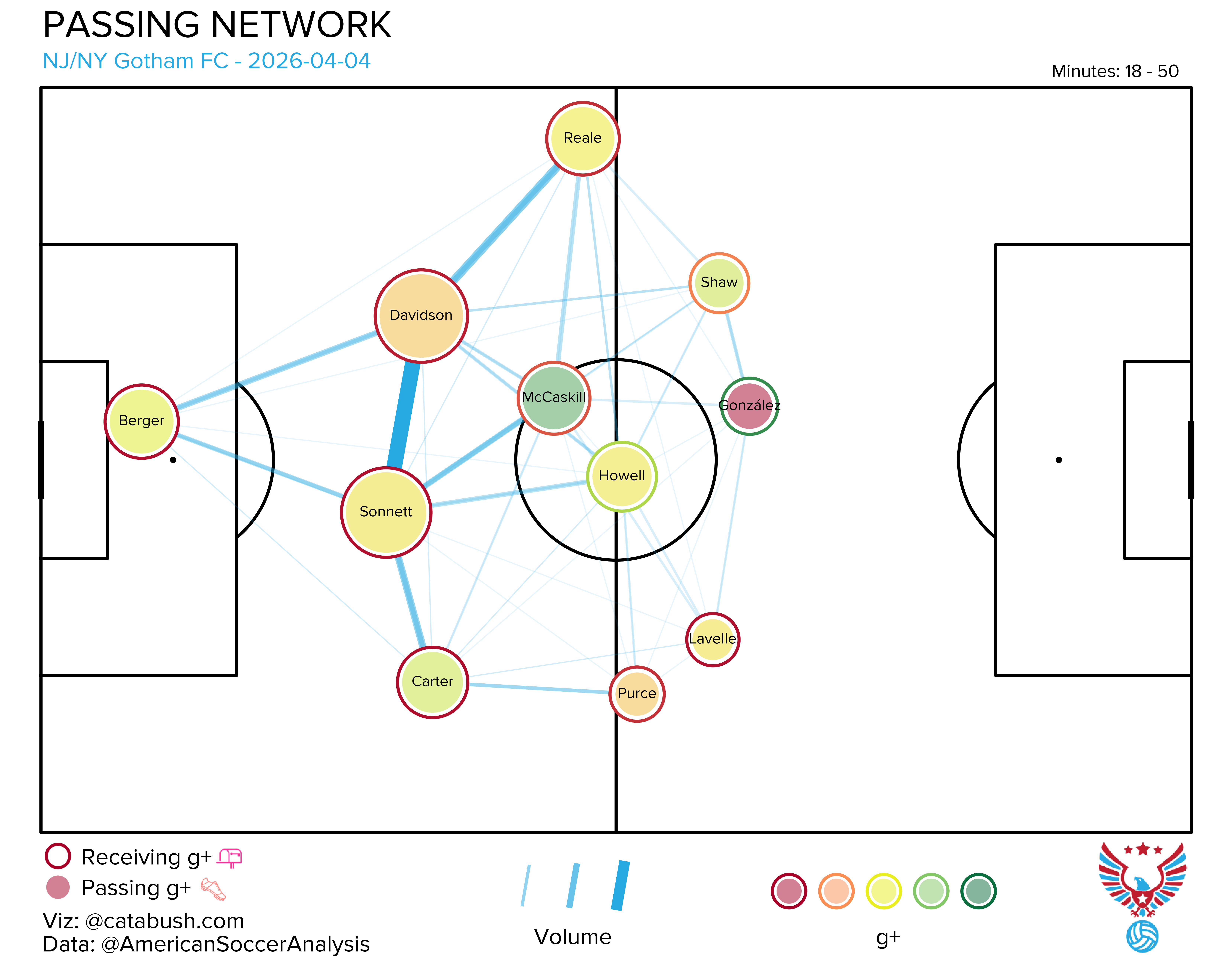 If you want some deeper info on the nerdery that’s about to follow, I got you. Read and reference this explainer for a breakdown of all the elements on the shot charts and goals added (g+) passing networks I’ll be dropping all season. The good Cata Bush helped bring these to life, and there’s a lot of data captured across the two visualizations.