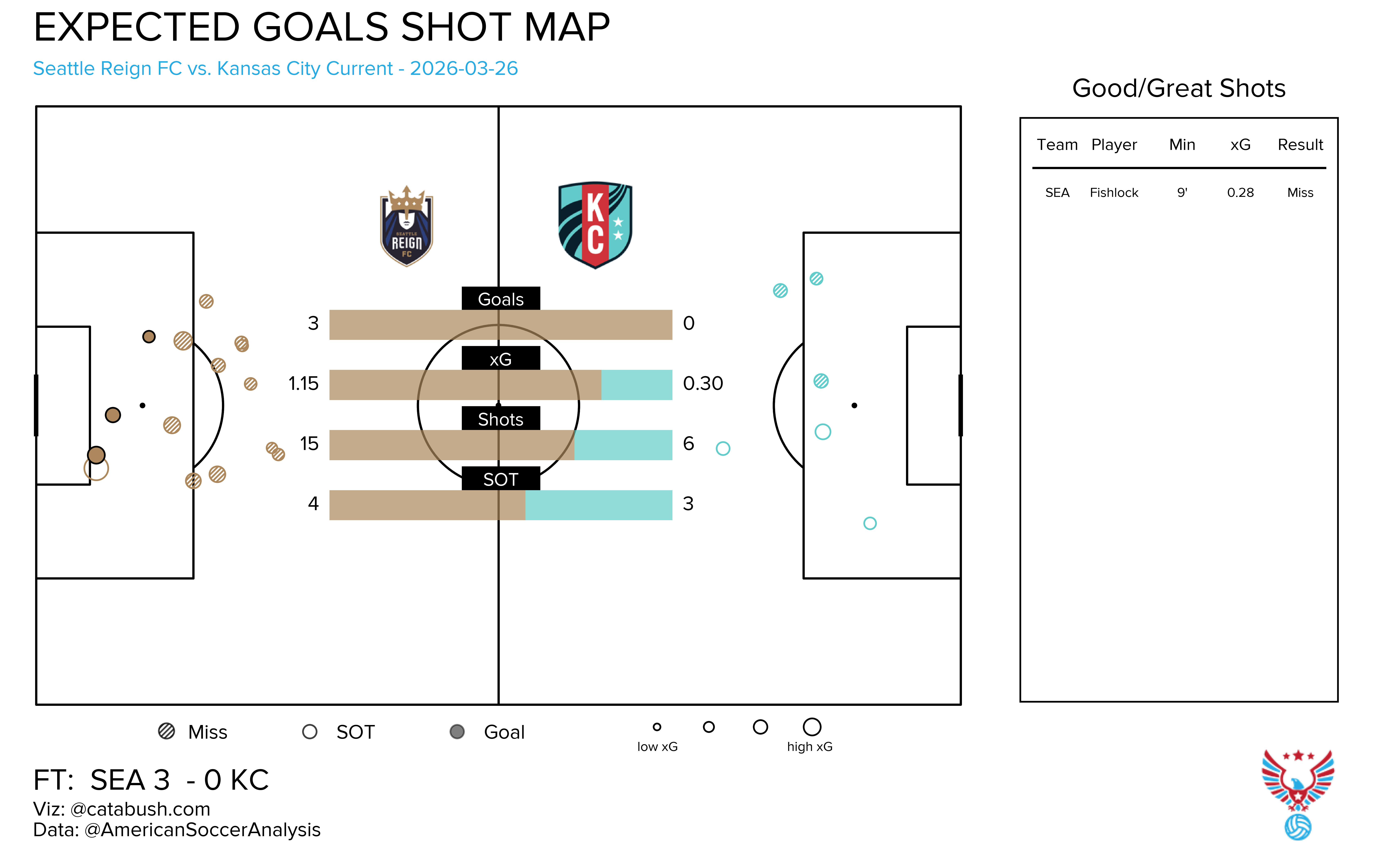 Still, only one quality chance was created all game (which was missed), so three goals wasn’t expected. However, the bigger story is Kansas City’s .30 xG from just six shots. Chris Armas tried a bonkers, heavily rotated lineup that got worked by Seattle’s experienced players, primarily Jess Fishlock and Sofia Huerta.