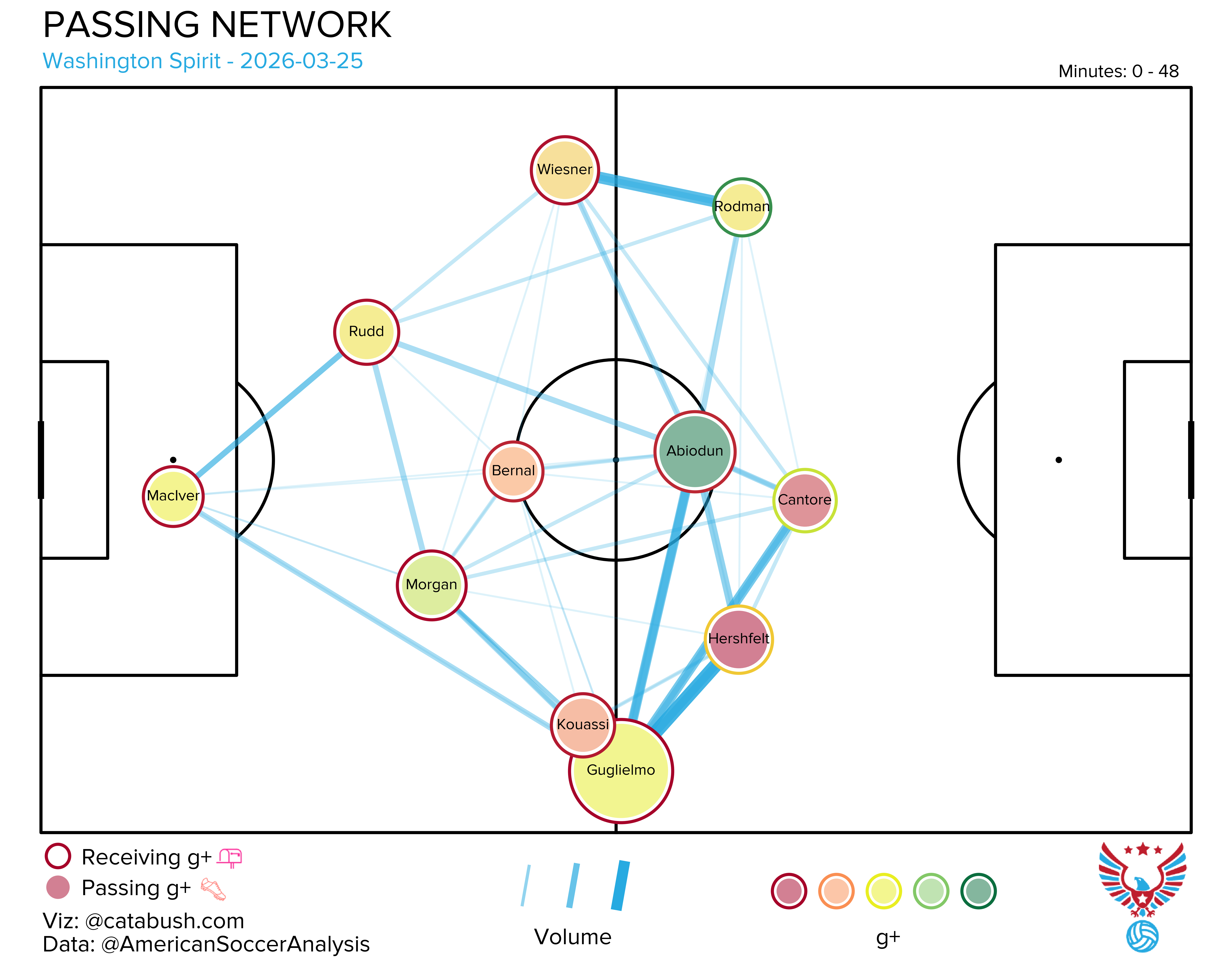 If you want some deeper info on the nerdery that’s about to follow, I got you. Read and reference this explainer for a breakdown of all the elements on the shot charts and goals added (g+) passing networks I’ll be dropping all season. The good Cata Bush helped bring these to life, and there’s a lot of data captured across the two visualizations.