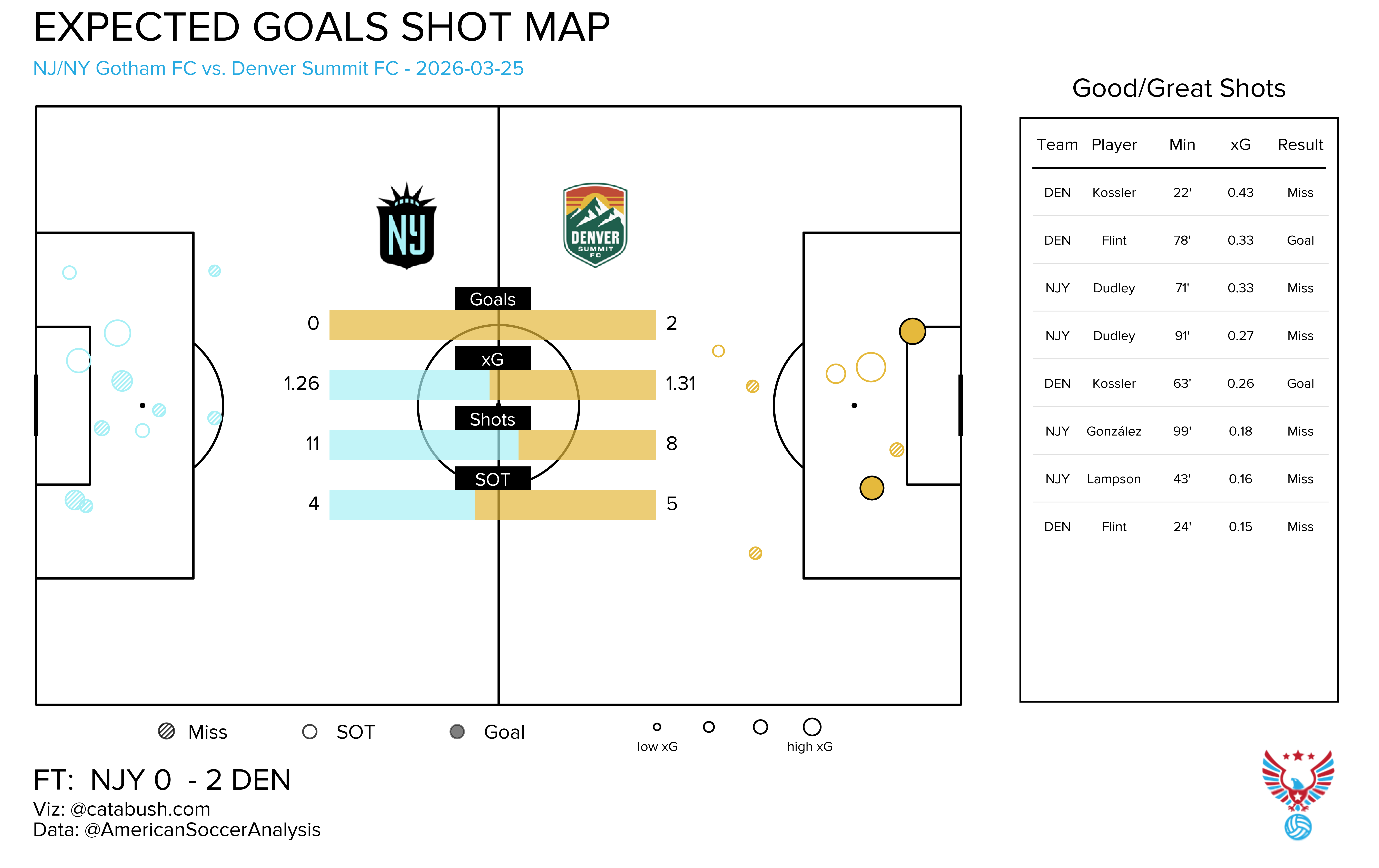 Denver played deep and clogged the middle of the pitch to force Gotham’s wide creators to create. In attack, they just bided their time until they could work out how to get efficient sights at goal without taking too many risks. It’s a very good gameplan for an expansion team, and if Denver is going to be good at executing it then they’ll keep picking up unexpected points, especially if Kössler remains consistent.