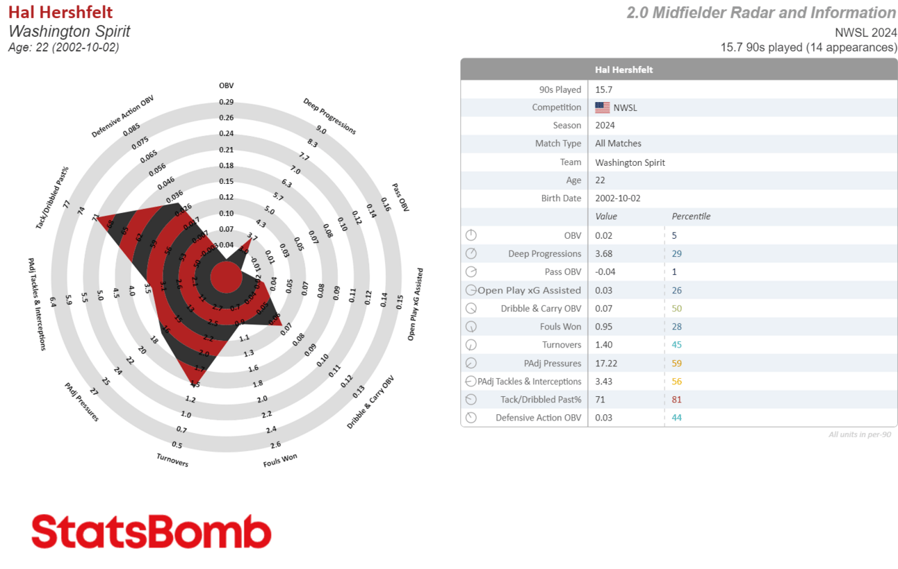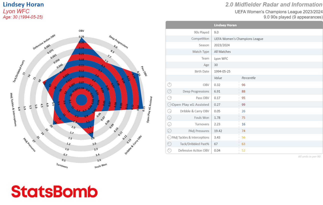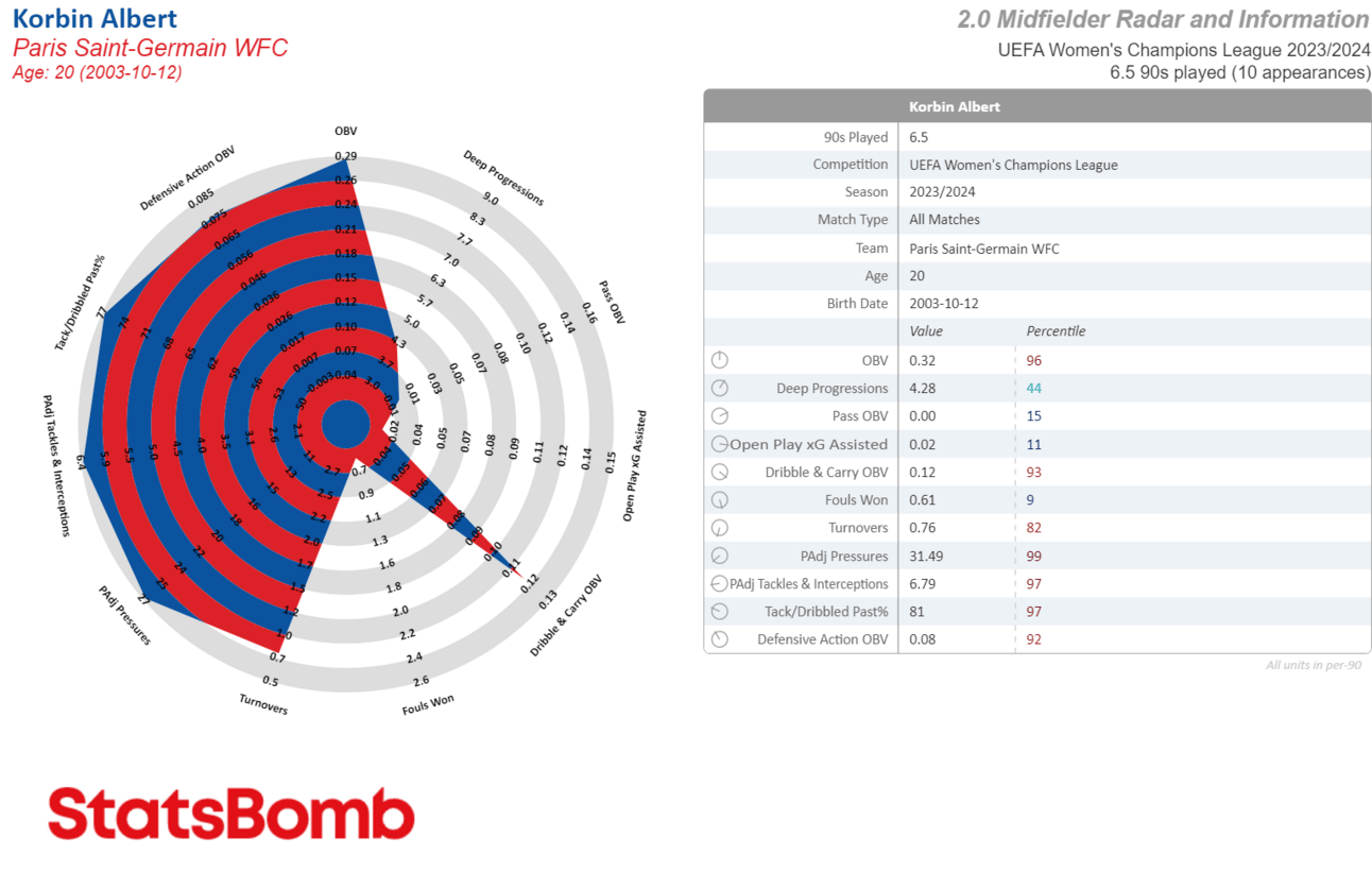 Impressive, but sample size matters and this is only 6.5 90s. Also looking deeper, her main job was defending, but other aspects of midfielding — passing, progressing, press resistance — were lacking or nonexistent. This is probably why Albert lost her starting spot to Jackie Groenen late in the season.