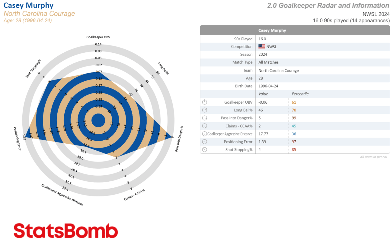 Murphy’s biggest strengths have been shot stopping, avoiding positional errors, and an ability to ping passes to players in space (low pass into danger%).