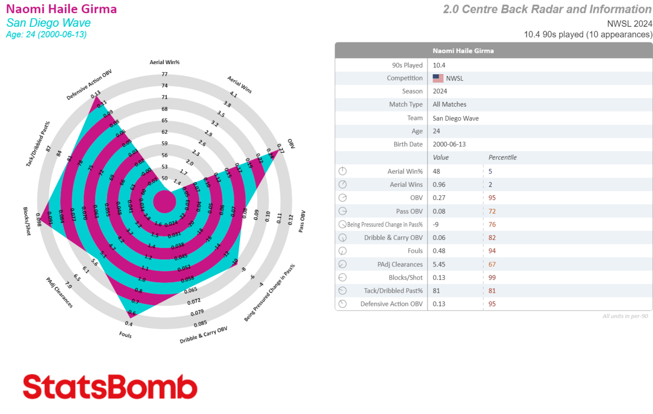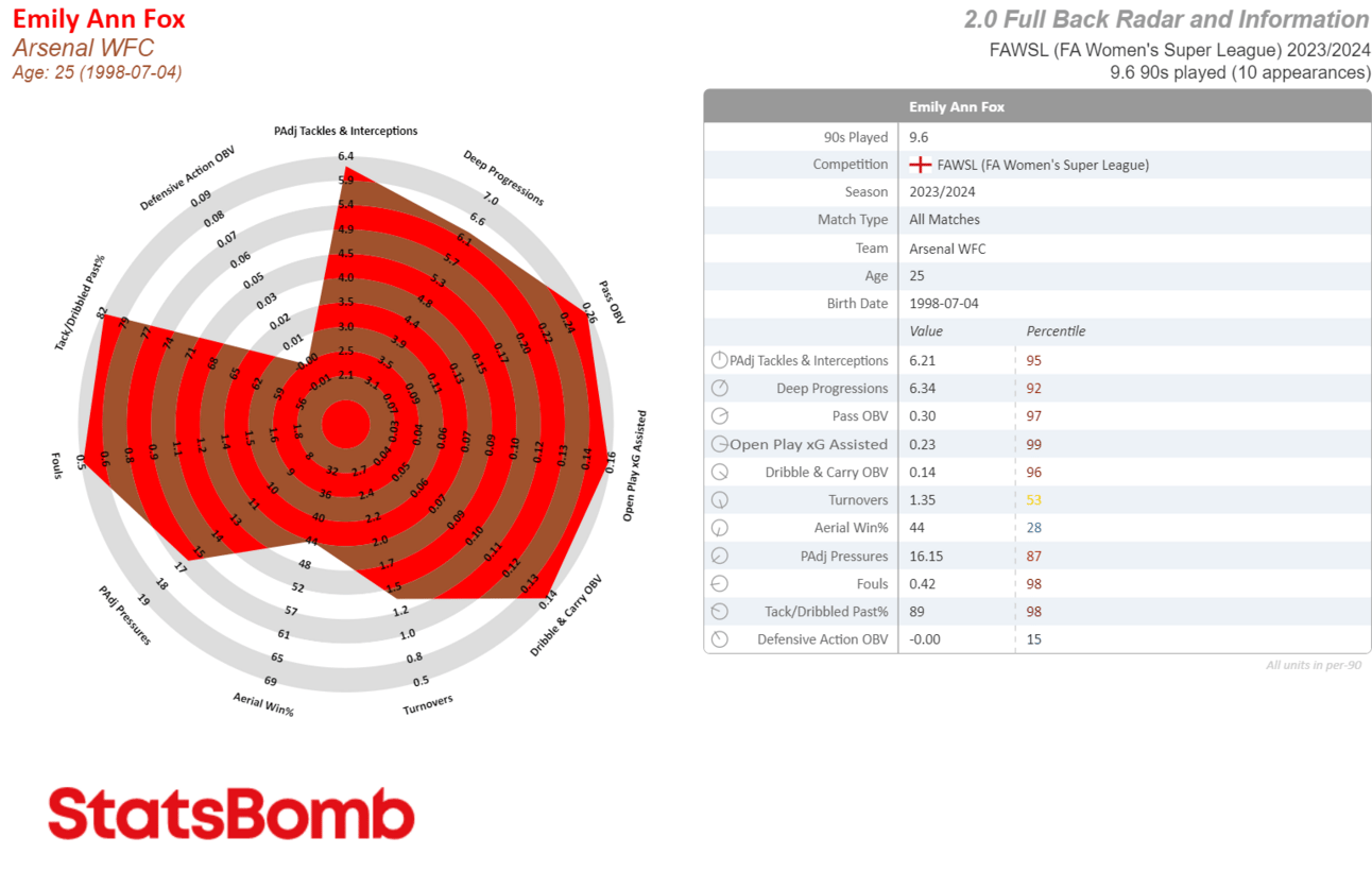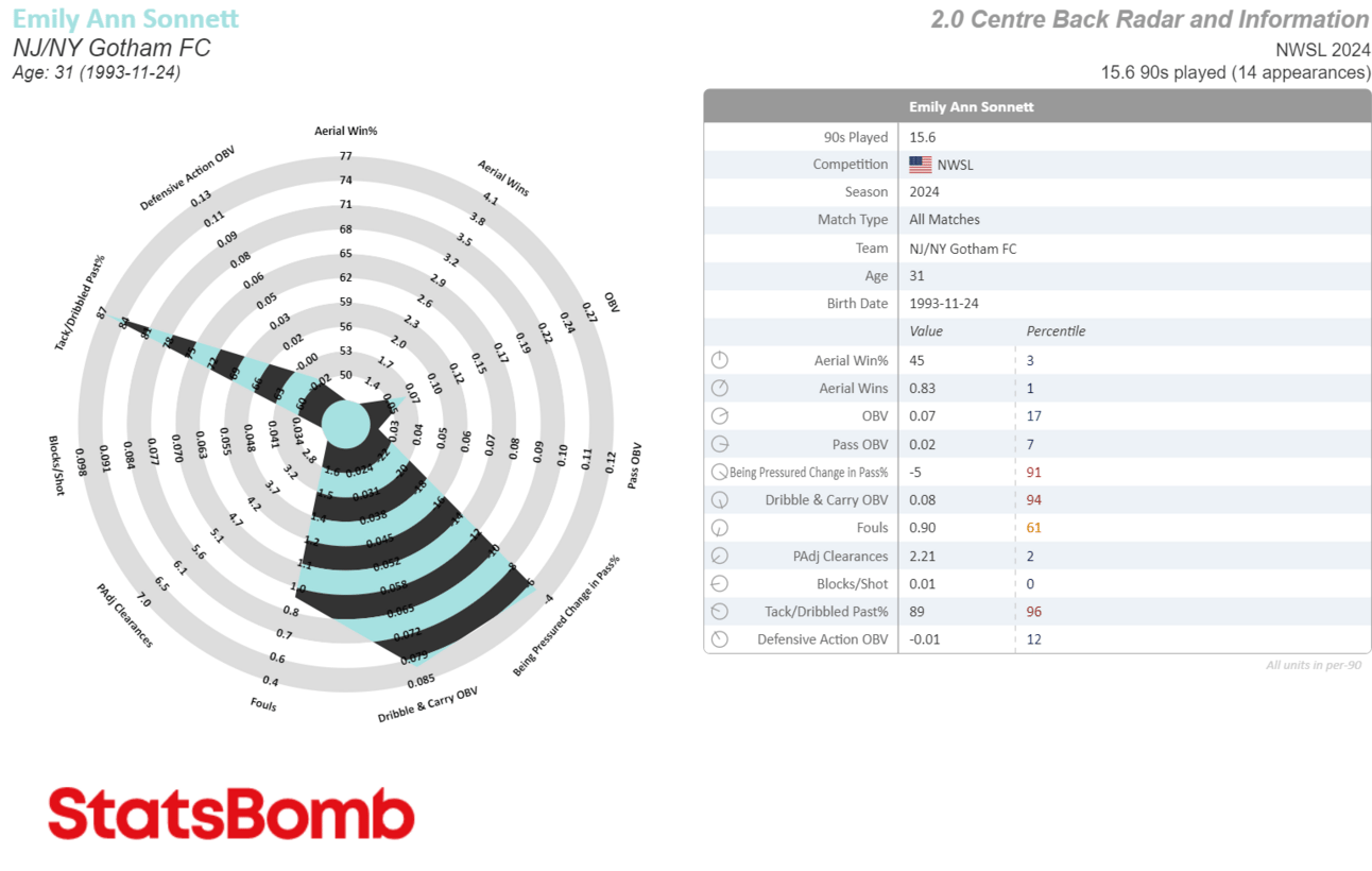 Whenever I see weird shards jutting out like this it’s usually because there’s a random collection of stats that’s making it difficult to fit onto a preset radar. This is the case with Sonnett, because while she’s played more CB than anything else so far (largely due to teammate injuries), Juan Carlos Amoros has also played her at RB, CDM, CM and even once at CAM, which didn’t last long but was real silly.