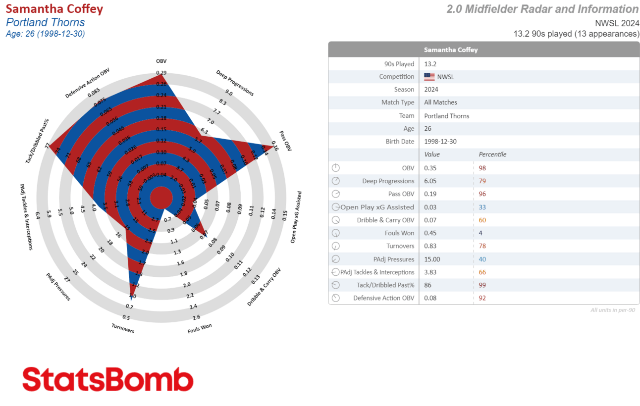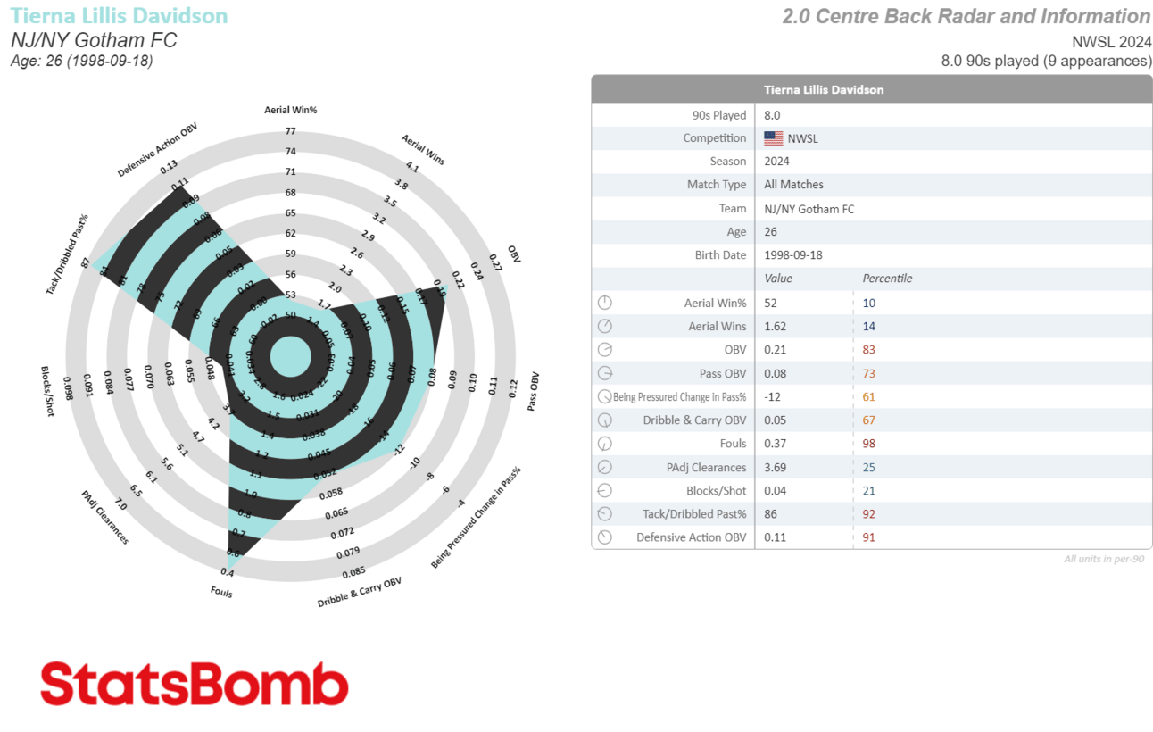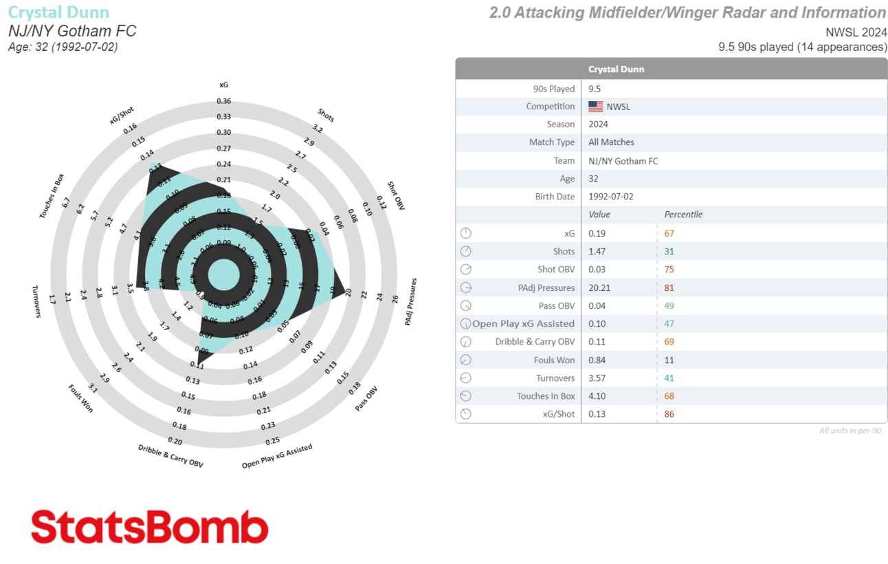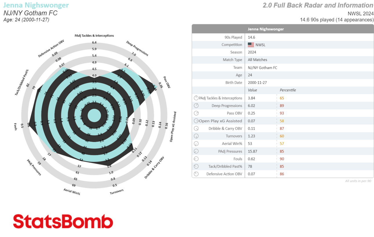 Whenever I see weird shards jutting out like this it’s usually because there’s a random collection of stats that’s making it difficult to fit onto a preset radar. This is the case with Sonnett, because while she’s played more CB than anything else so far (largely due to teammate injuries), Juan Carlos Amoros has also played her at RB, CDM, CM and even once at CAM, which didn’t last long but was real silly.