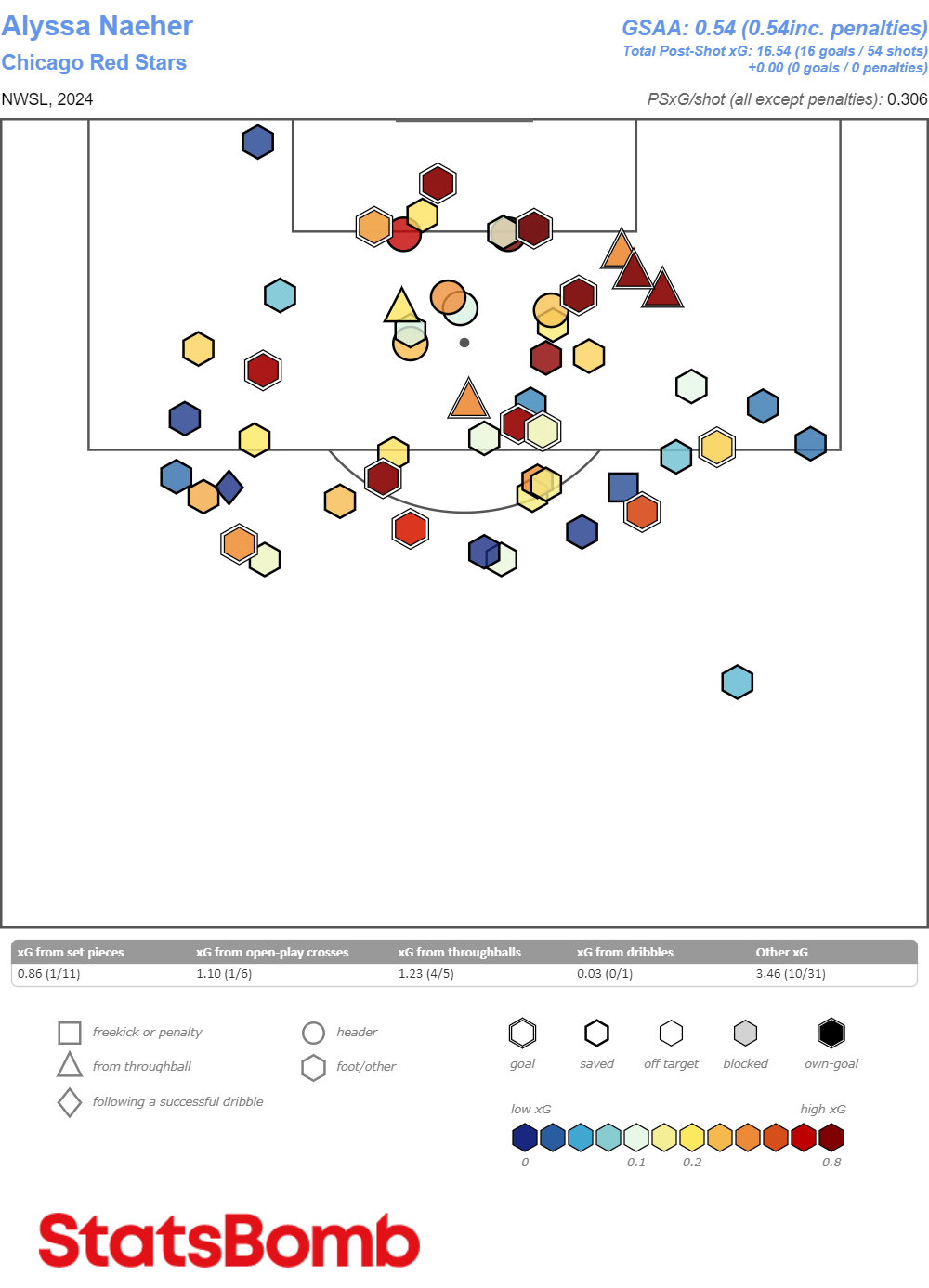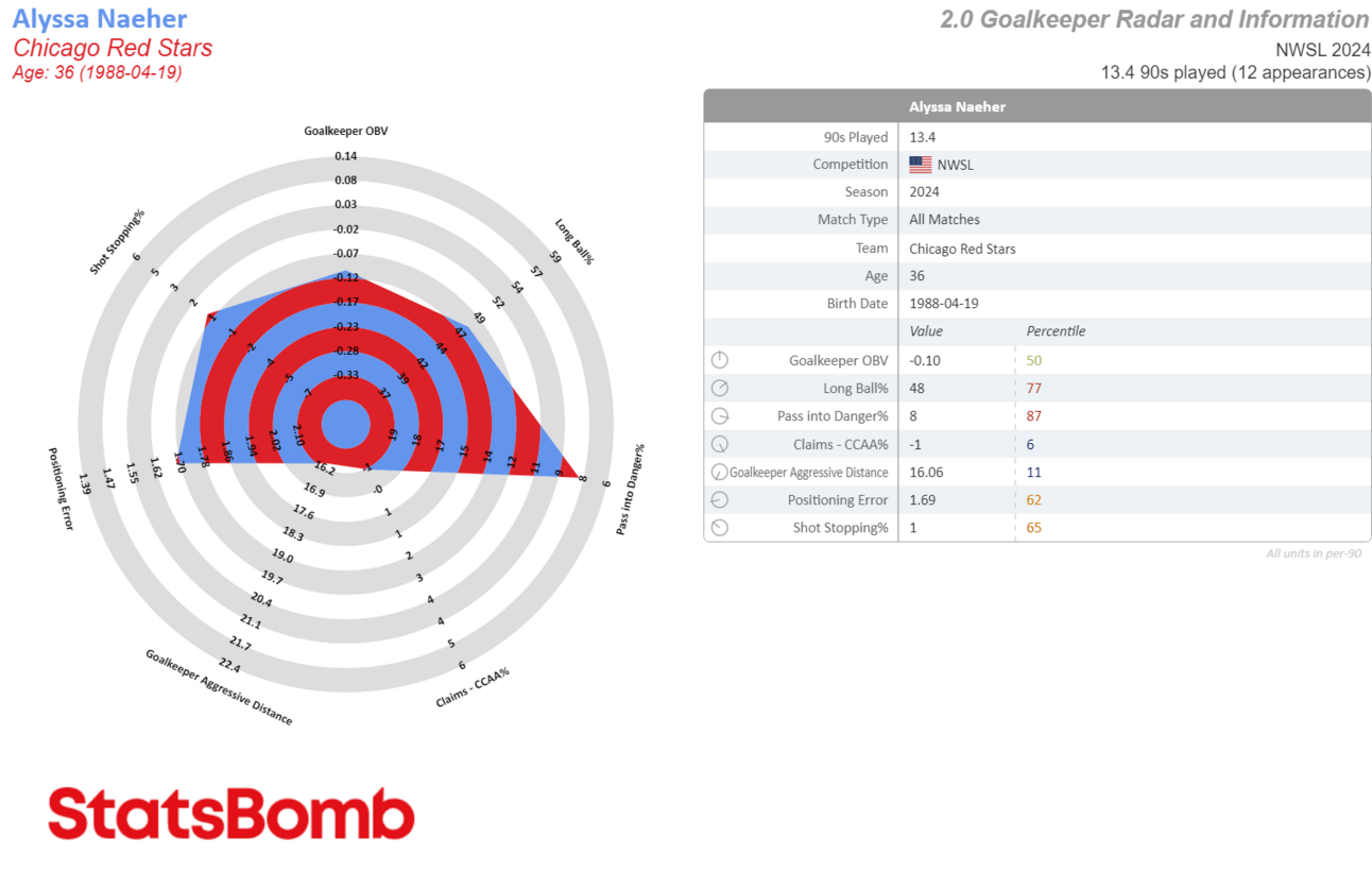 Naeher’s .54 GSAA is not only lower than Murphy (2.01) and Campbell’s (3.26), but also Laurel Ivory (.55) and Mandy Haught (3.53). This doesn’t mean Haught is a better goalkeeper than everyone Hayes called up (she also leads all keepers in positioning errors per 90, with 2.28).