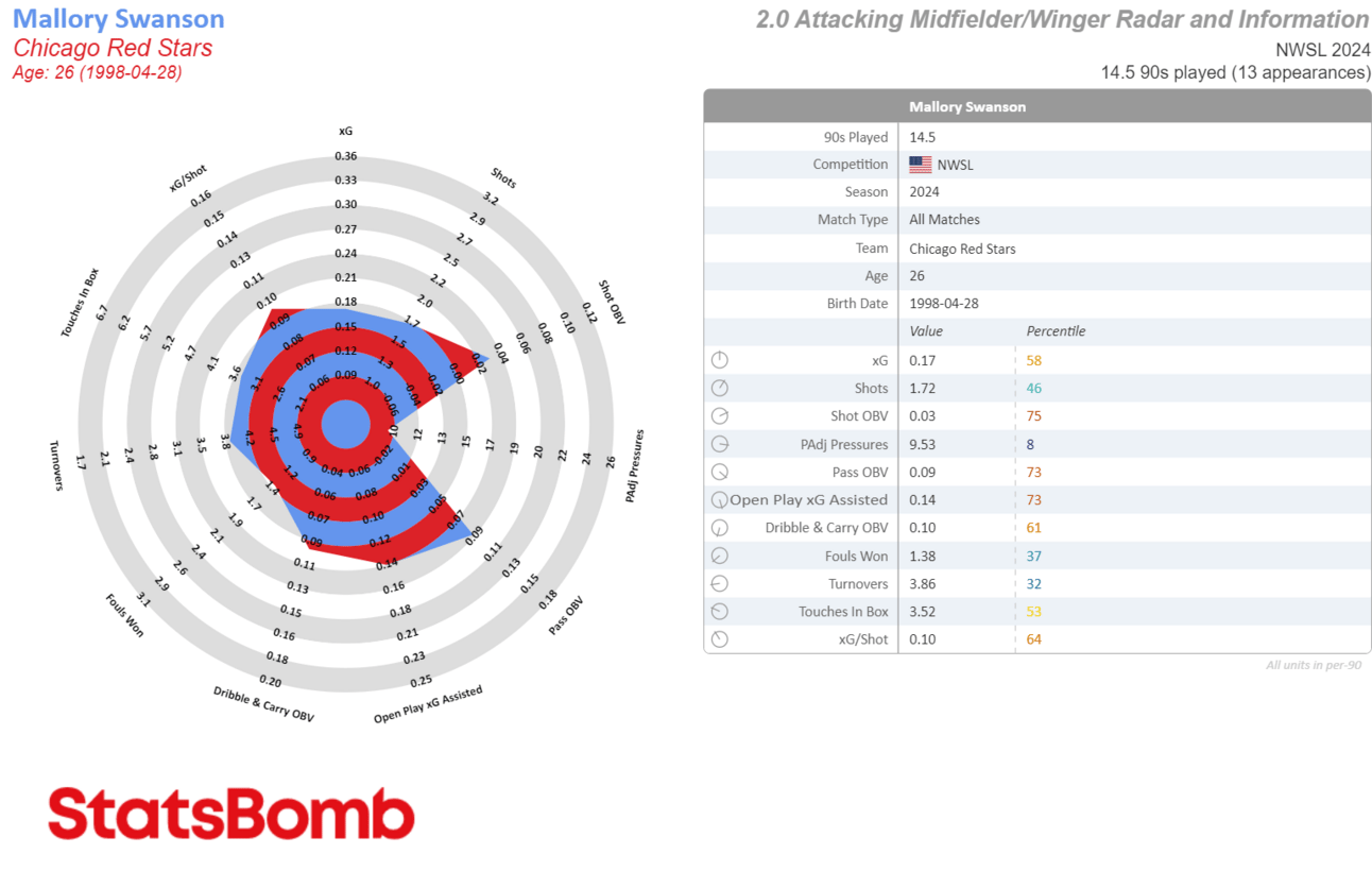 Below, I’m dropping every player’s StatsBomb 2.0 radar up to this point in the season. I’m sure you’ve seen these radars plenty, but if not, they’re neat little snapshots of how players are performing, and provide hints at their profile and overall form. The 2.0 radars include StatsBomb’s proprietary metric, On Ball Value (OBV). Basically think of these as buckets of metrics categorized within pass, dribble & carry, defensive action, shot, and goalkeeper metrics.