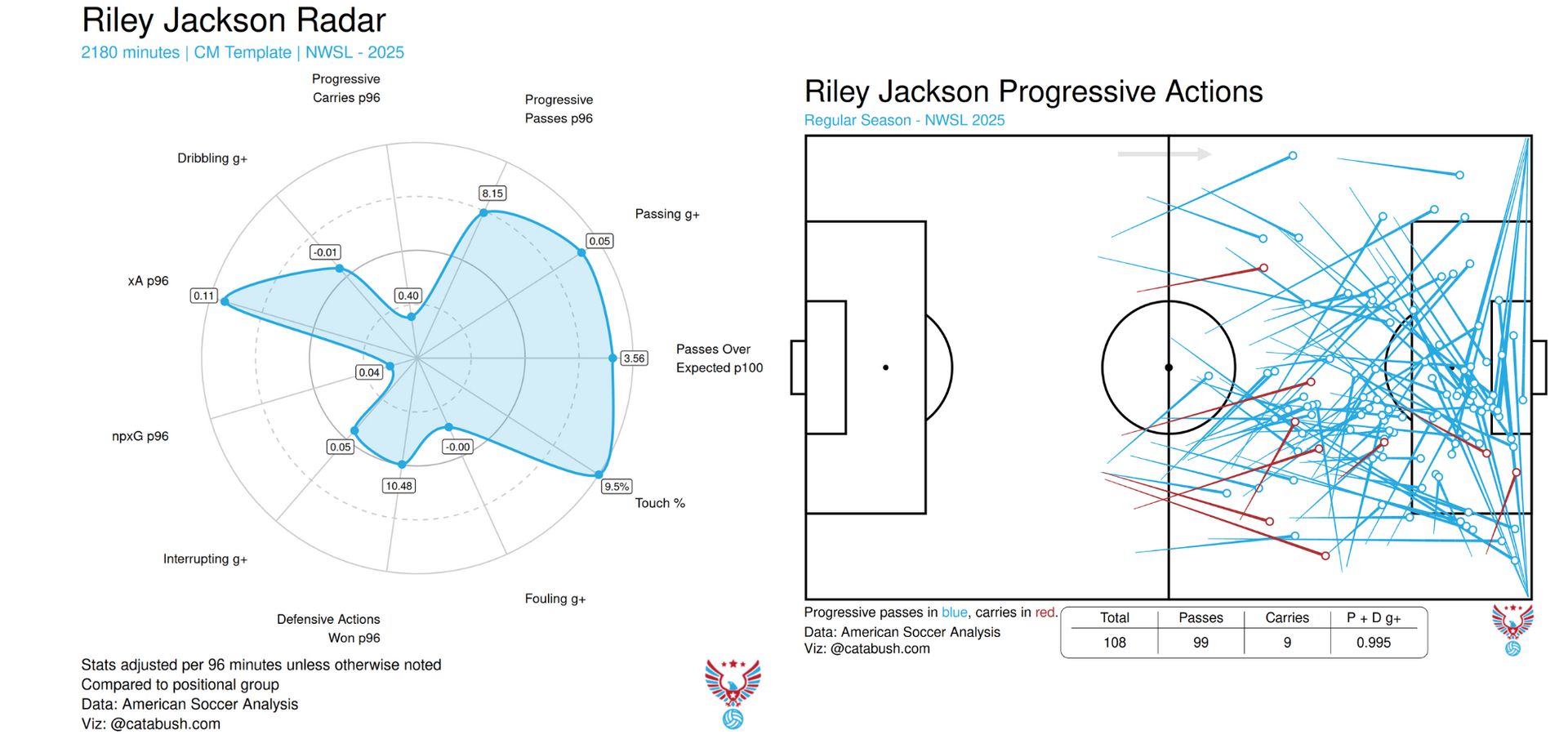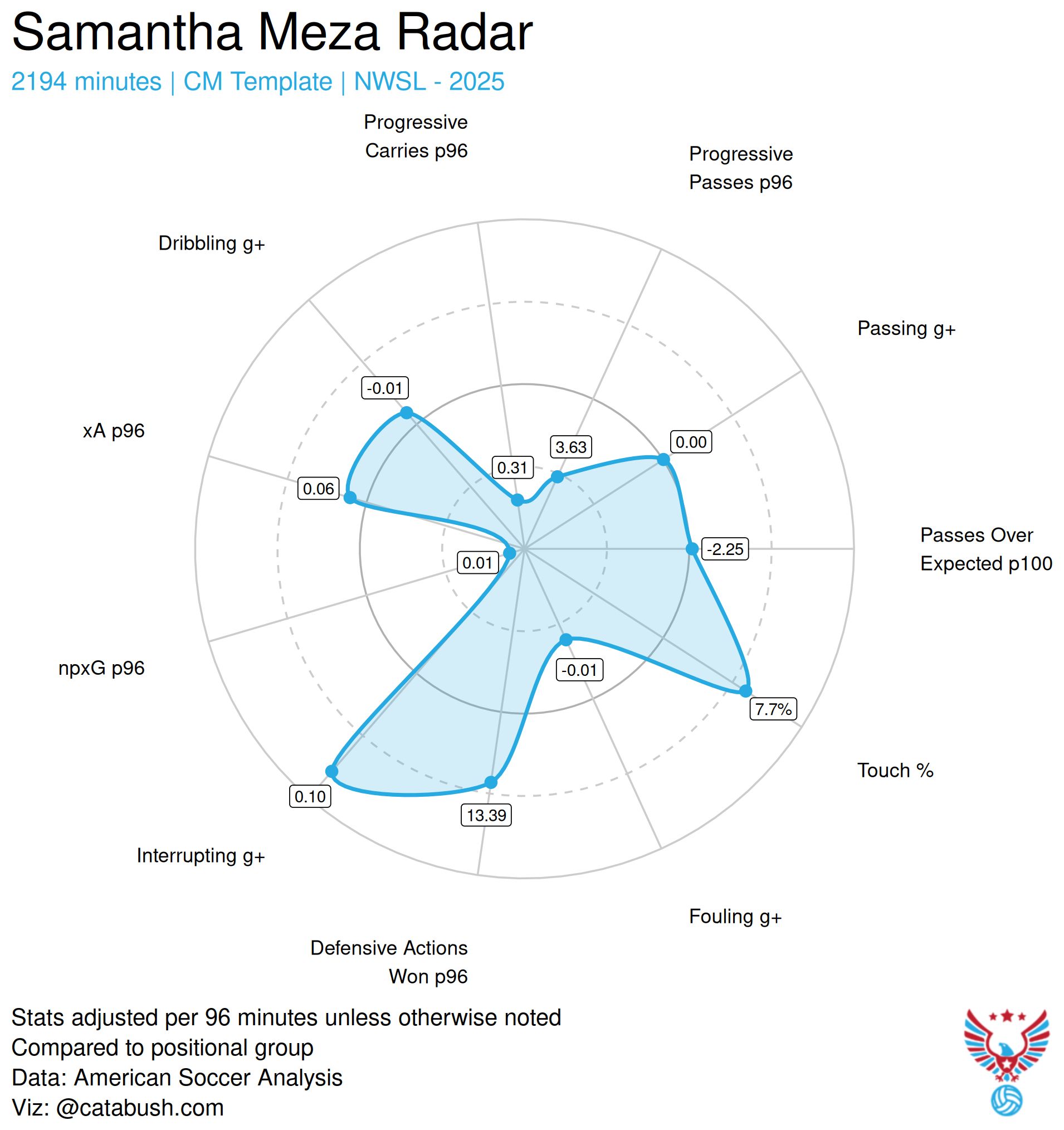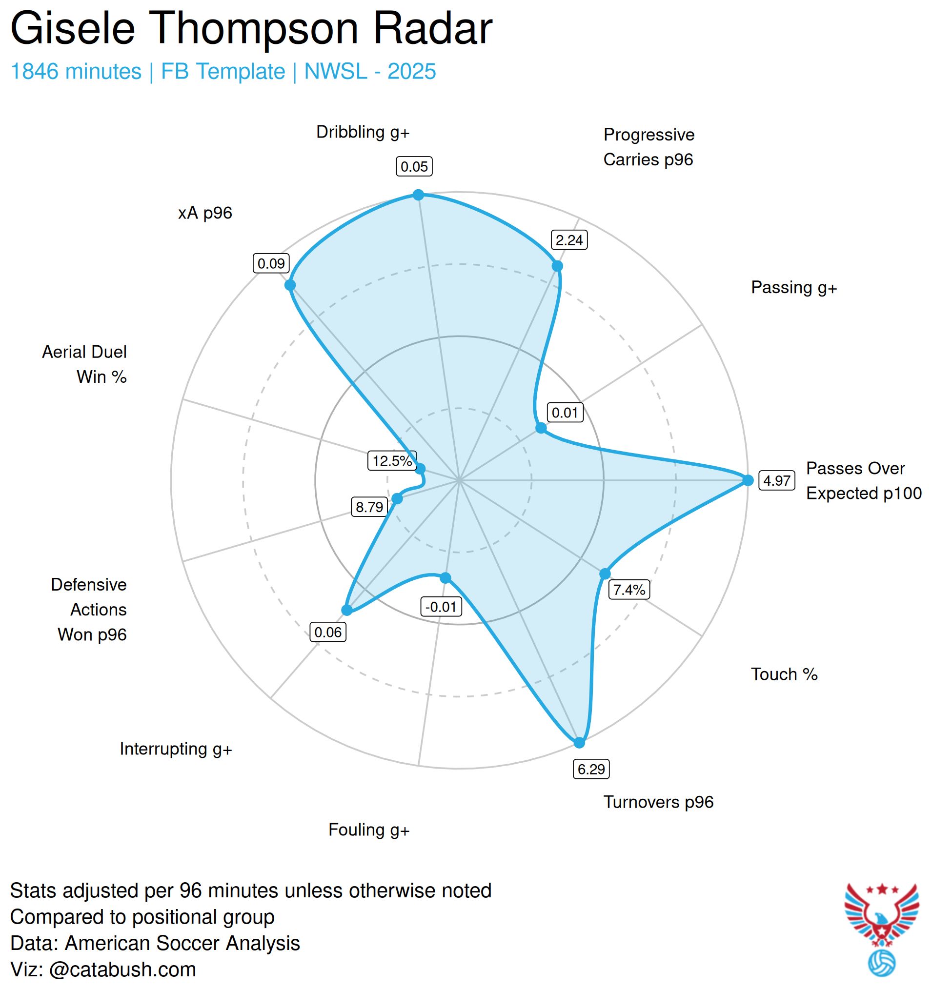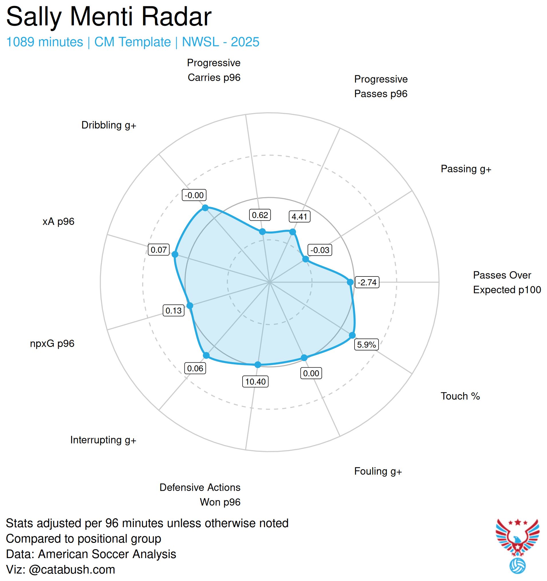 She’s just very good at what she does and that is: being Hal Hershfelt. Personally, I don’t think the stats capture how subtly she receives and repositions the ball to open up passing angles to the other side of the pitch. The Spirit don’t often switch play with a ling diagonal punt, instead they use Hershfelt, and she is very good at it. Where does that fit on a national team? I will leave that to Emma Hayes to figure out.
