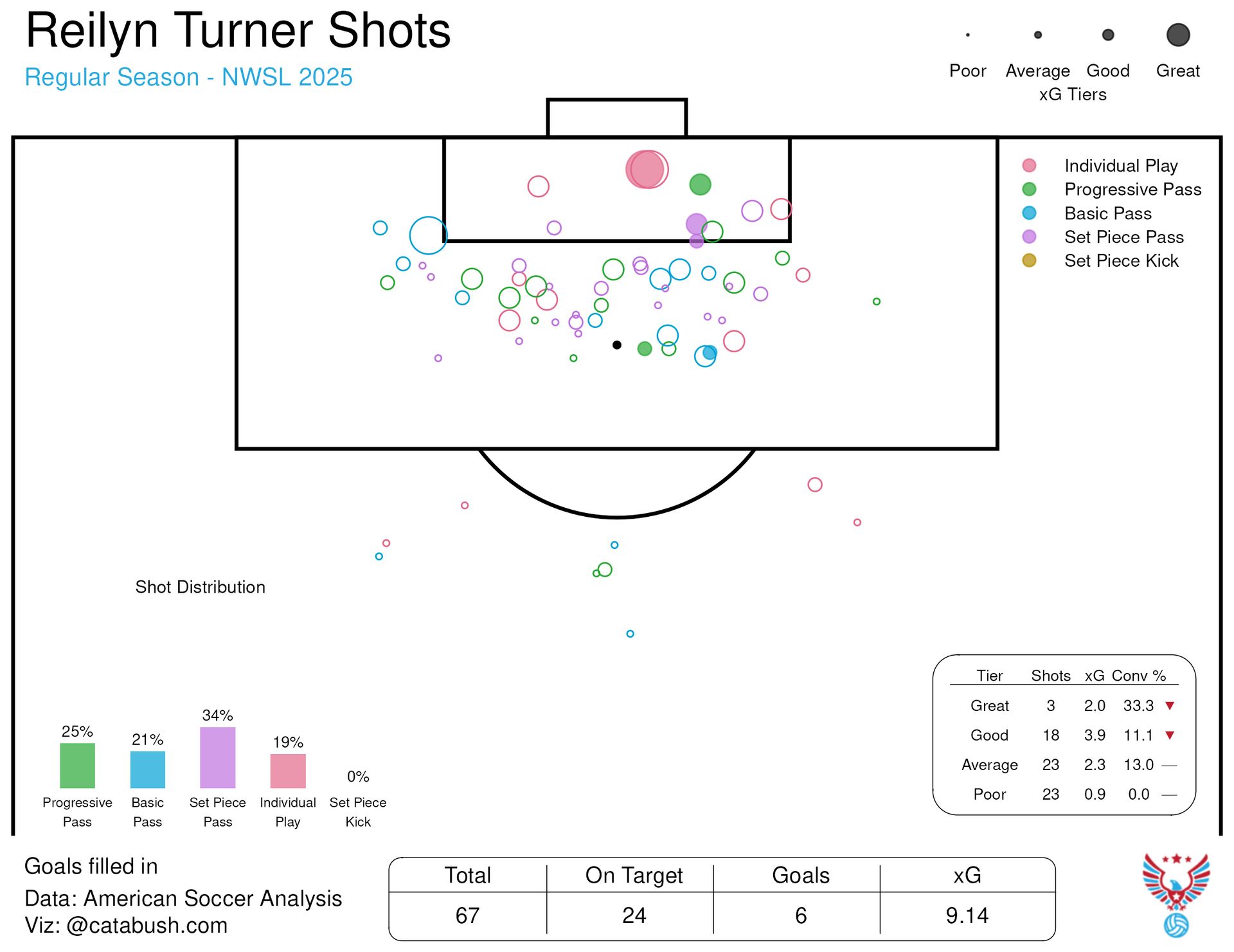 I don’t know if Reilyn Turner was always utilized correctly under Rob Gale (ok that was just me being nice, I do know, and she was not), but there’s a serious goalscorer who could have a breakout season in the right setup. From a shots perspective, this is exactly what you want from a center forward. Turner took an overwhelming amount of her shot in areas below the penalty spot, and within the width of the six yard box.
