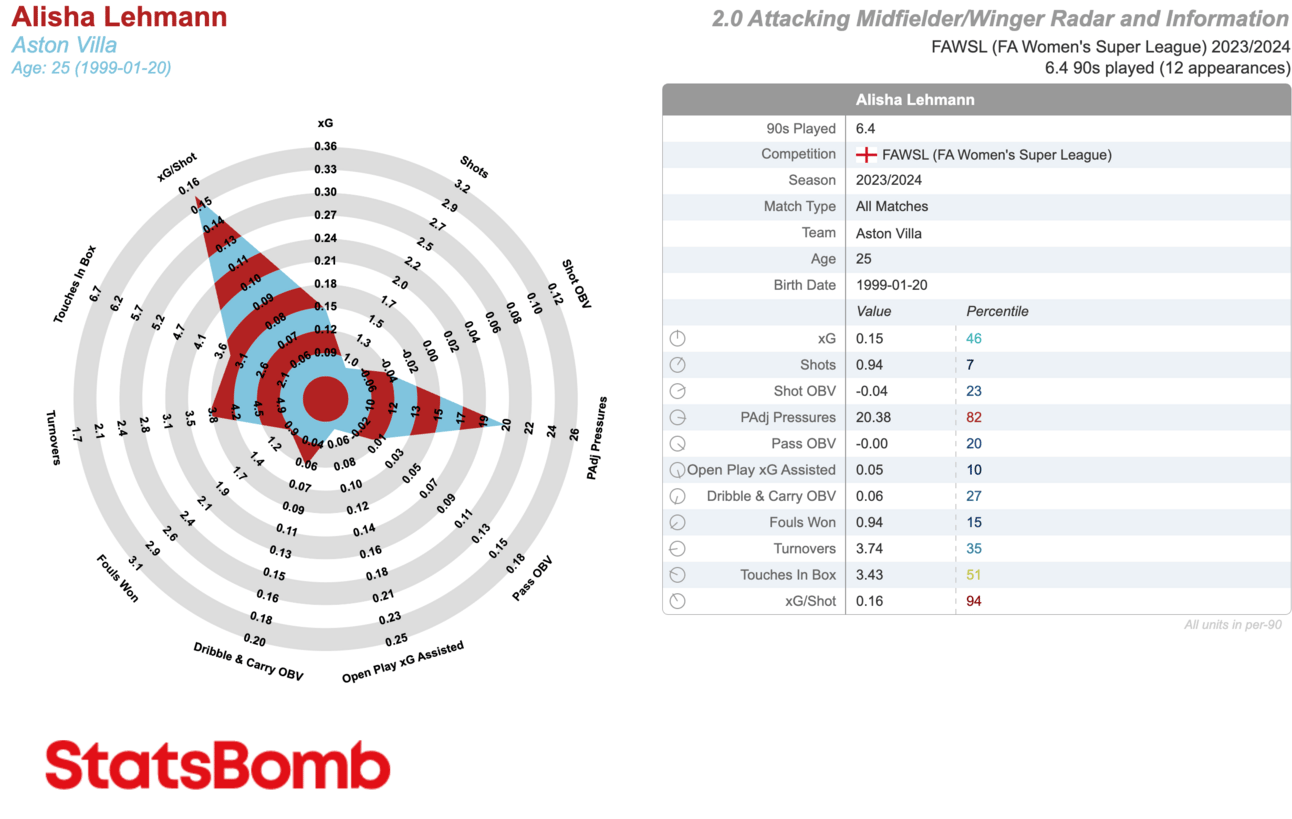 This can’t even be chalked up to a bad year. Lehmann’s best year was in 2018/19, when she first arrived in the WSL. Since scoring six goals and dropping three assists that season, she’s yet to hit either number again. Villa even went bonkers last season and scored 47 goals, somehow Lehmann only scored five of those and managed only two assists, despite playing in 22 matches and starting 18.