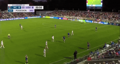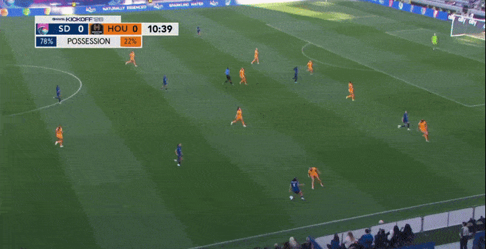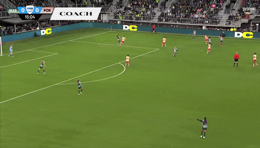 Beyond the dub, an encouraging aspect of the match was the Courage pulling off this move 23 minutes into his tenure. I particularly loved the patience to setup defenders and give teammates chances to find optimal positions to receive passes. The little stutter step Dani Weatherholt (#17) does along the sideline before passing and running forward froze a potential pressing defender and gave Riley Jackson (#16) time to drop into free space below her.