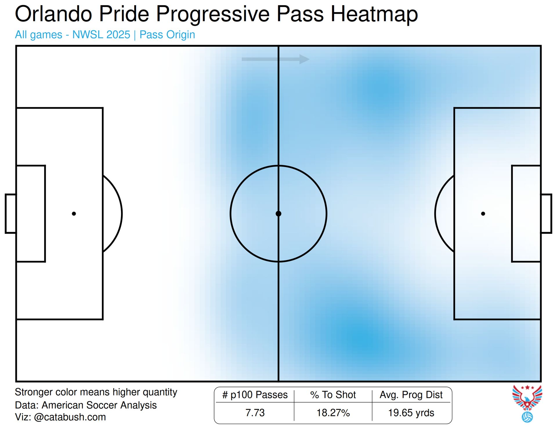 Whether Seattle play in a back-4 or back-5, part of their success in stopping opposition attackers (aside from a dash o’ luck) is their strength in wide areas. Madison Curry has been a demon defensively, and while Sofia Huerta isn’t exactly a defensive stopper, Jordyn Bugg is usually not too far away to help intervene. Wide areas are where Orlando to the bulk of their progressive passing, and likely tell the story of success or failure in attack.