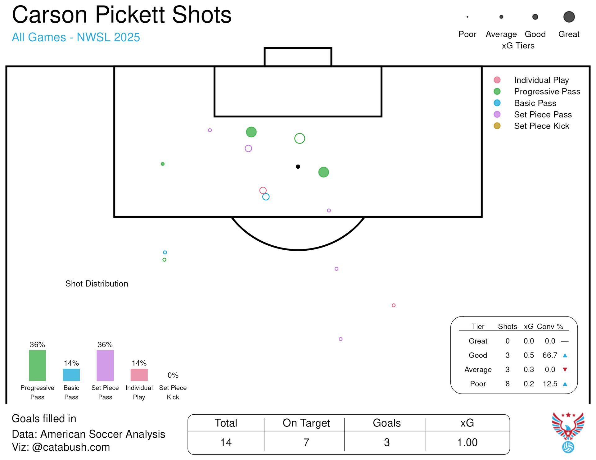 She’s scored two from cleverly timed runs into the box for high value chances, and the other was a filthy curler to the far post from a wide and narrow angle in the box. Hines hasn’t been able to fully unlock Marta or Ovalle, but Pickett has been able to read the space and sneak her way to good shooting opportunities in the box. It may not be conventional, or even intentional, but when the universe gives you a gift — particularly in 2025 — you take it and do not ask questions.