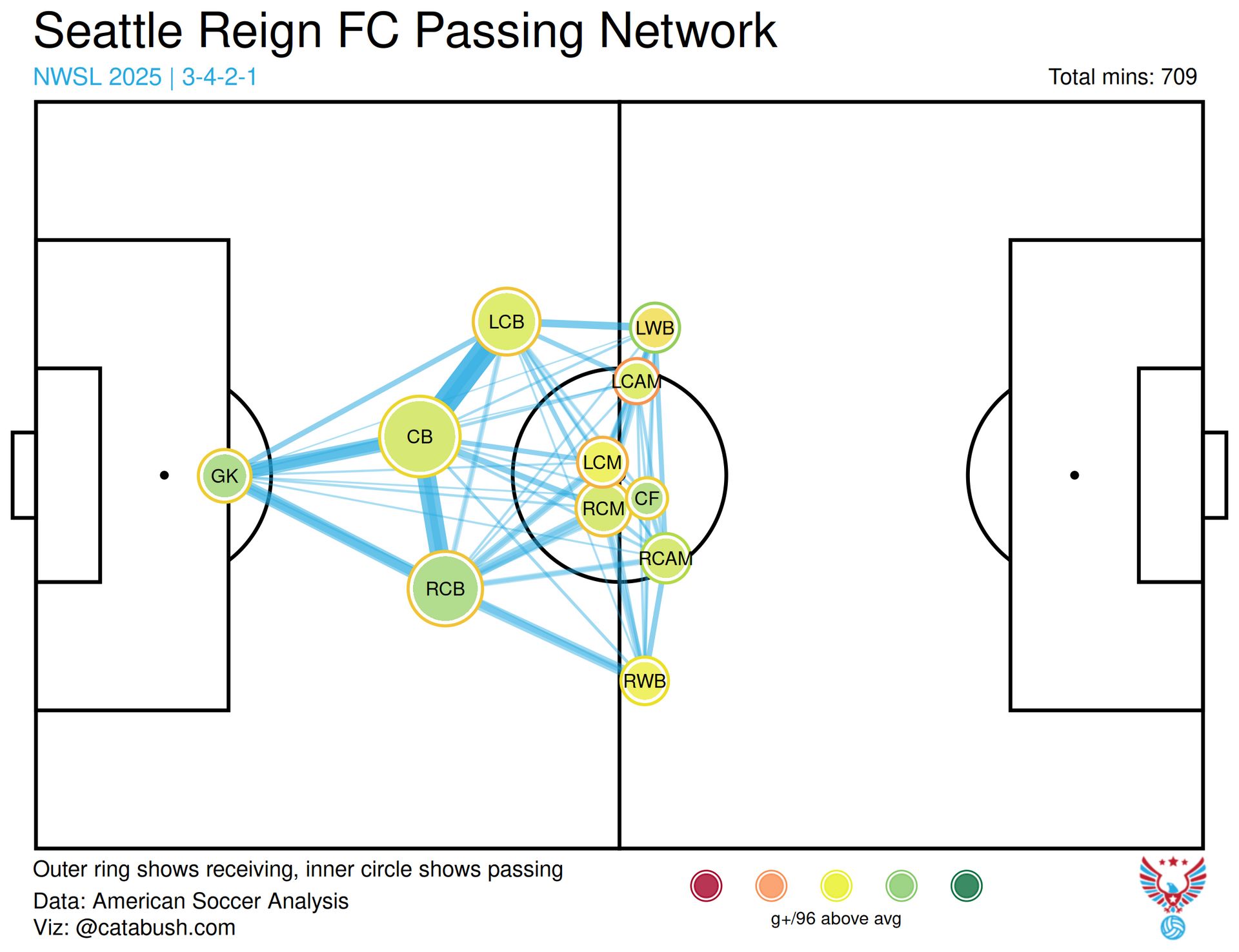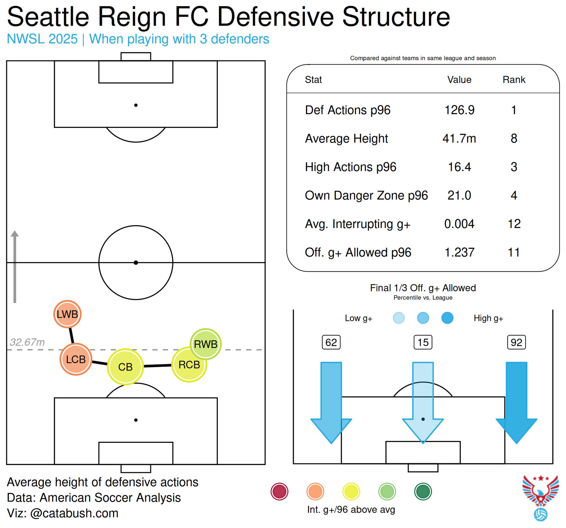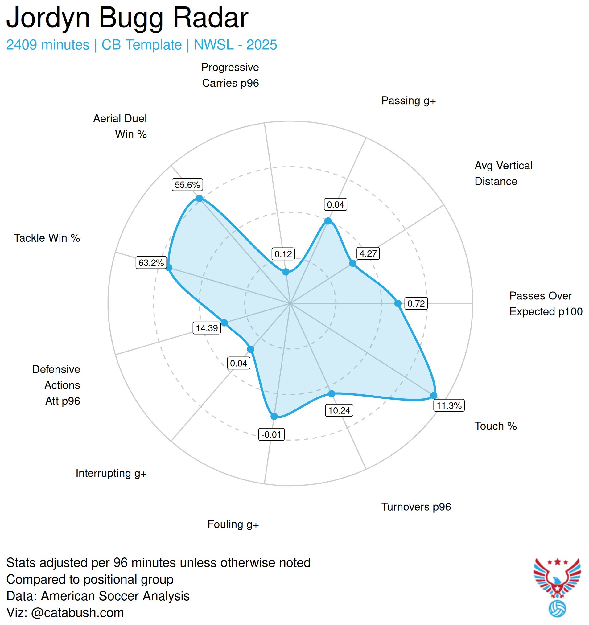 Bugg has had a ridiculous season. As a 19-year-old center back she has started in 24 or her 25 appearances this season. And despite what the numbers say about the Reign’s defensive record (their expected goals allowed per 96 [1.33] is higher than their actual goals conceded per 96 [1.08]), Bugg’s been hoopin, even despite having to shift between back-5 and back-4 backline setups.