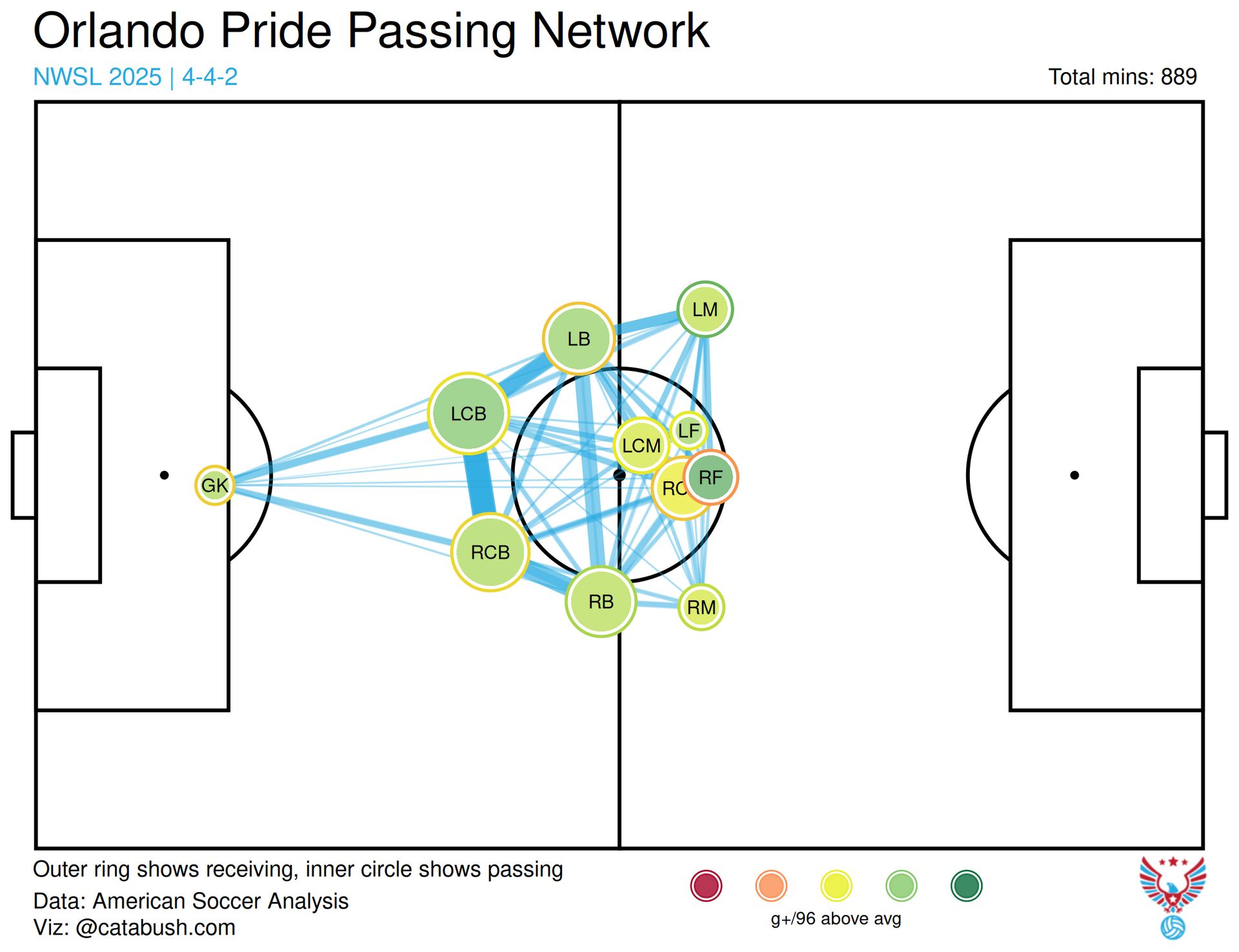 In attack, unless risks are taken that could open up the gaps Seb Hines doesn’t want to see, it’s quite vanilla. Deficient, even. Barbra Banda shouldering the combined loads of scoring and chance creation allows them to have a dynamic, sharp edge to their attack without making many structural sacrifices. Due to injury, Banda only played in 16 matches this season, but her 10.3 combine non-penalty expected goals (npxG) and expected assisted goals (xAG) was 17% of Orlando’s total. In actual goal contributions, her 9 goals (8 goals, 1 assist) were 33% of the Pride’s total goals (excluding own goals).