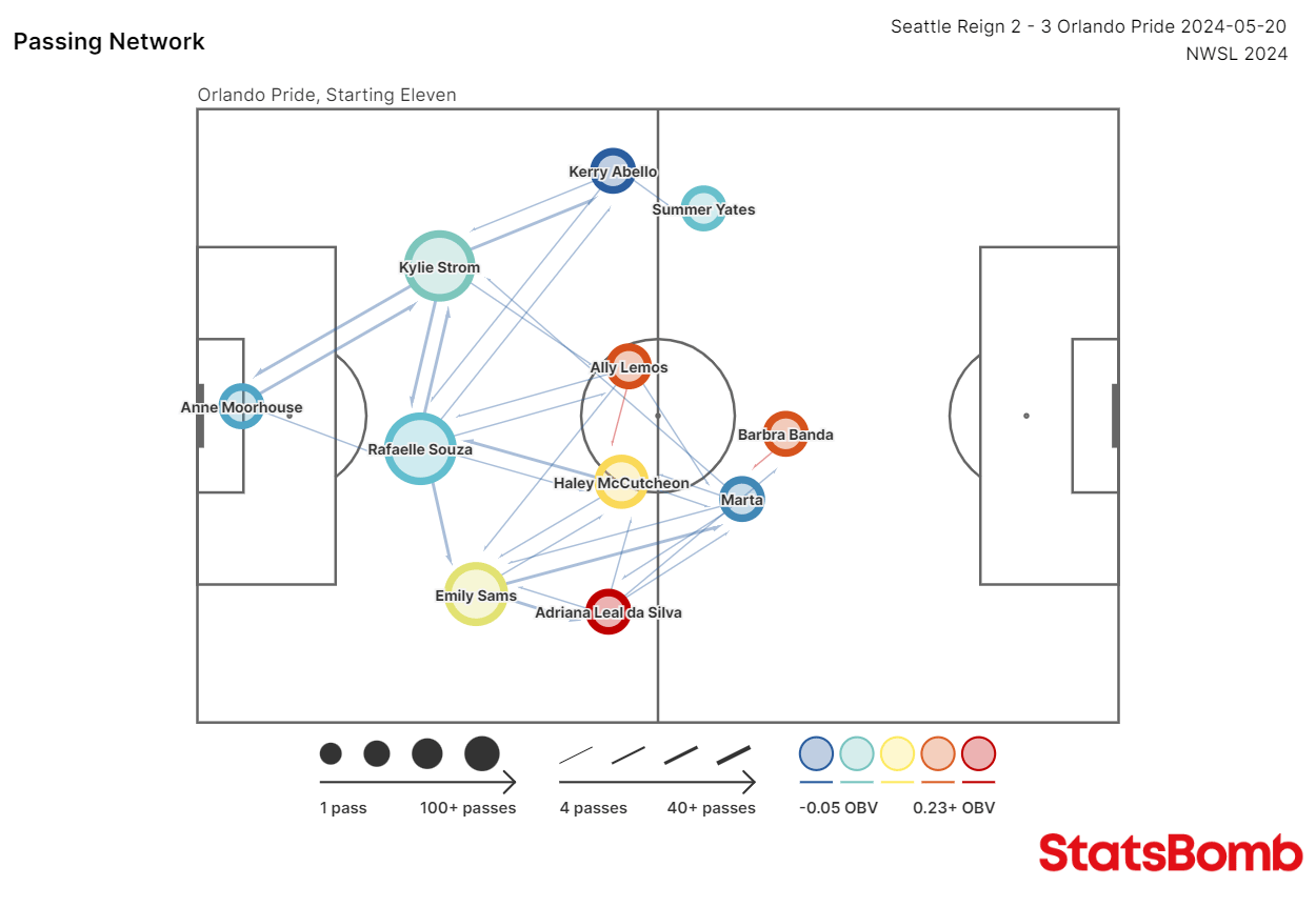 Reign being hit with two early goals forced Laura Harvey to fight back. They posted their highest number of shot creating actions, and open play passes leading to shots. I know it was game state, but Orlando is not an easy defense to crack. Hopefully this gives Harvey confidence to trust her attack more than she has until this match.