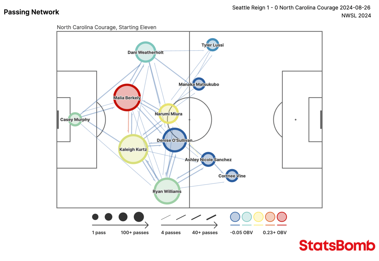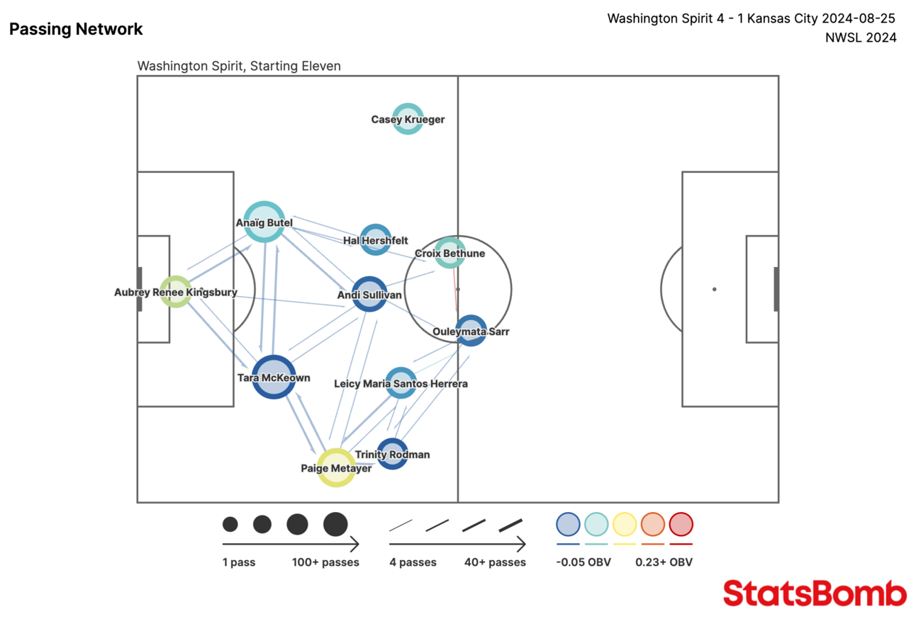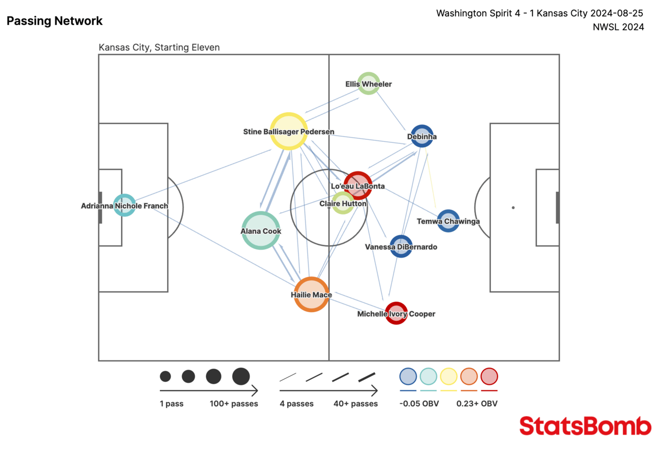 Honestly, looks good! Well except the very low pass OBV of Debinha, Chawinga and DiBernardo. That’s sort of expected of the last two, they’re typically scoring the goals. But DiBernardo has been playing at an MVP-conversation-worthy level and just didn’t have the time or space to execute against the Spirit.