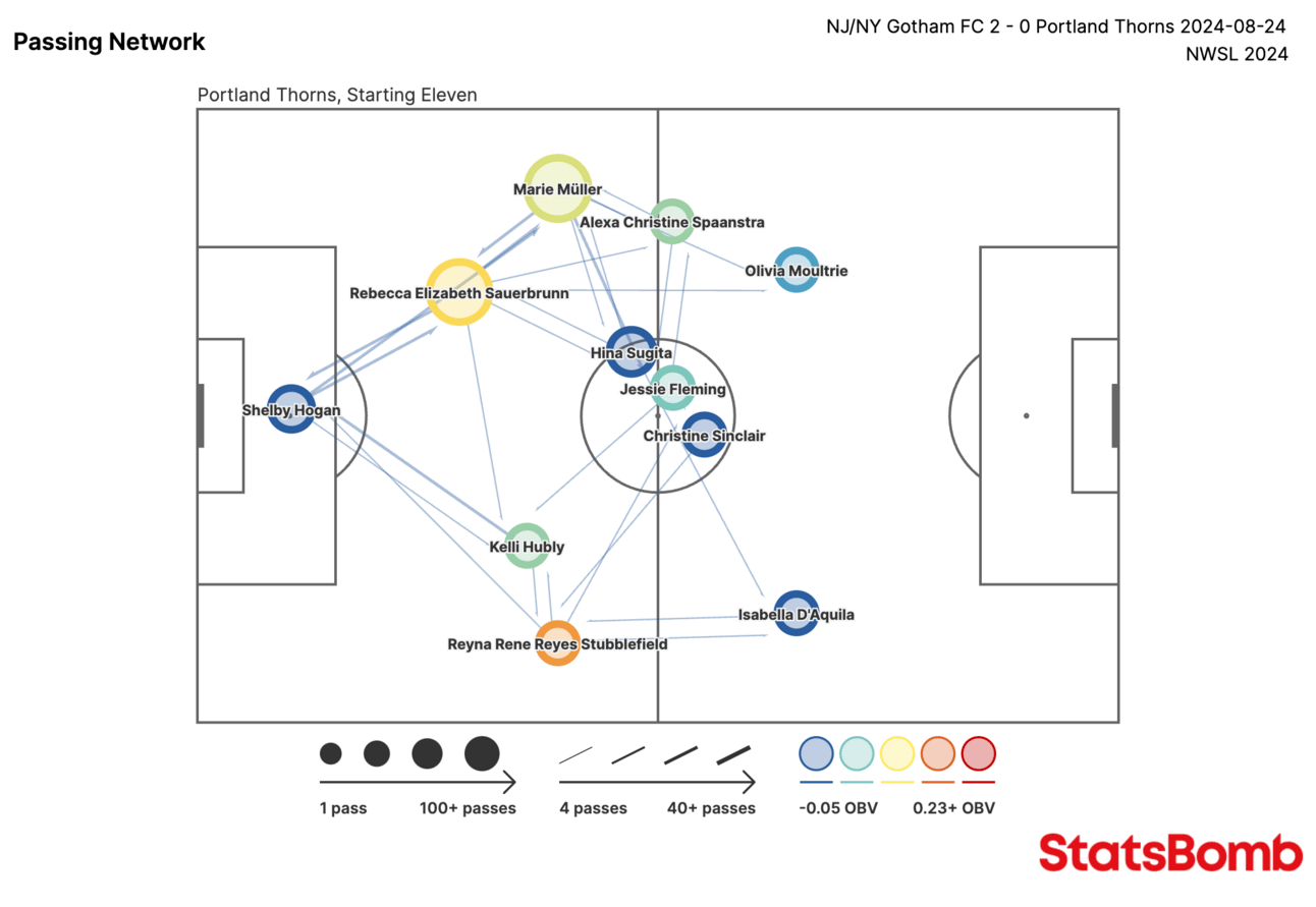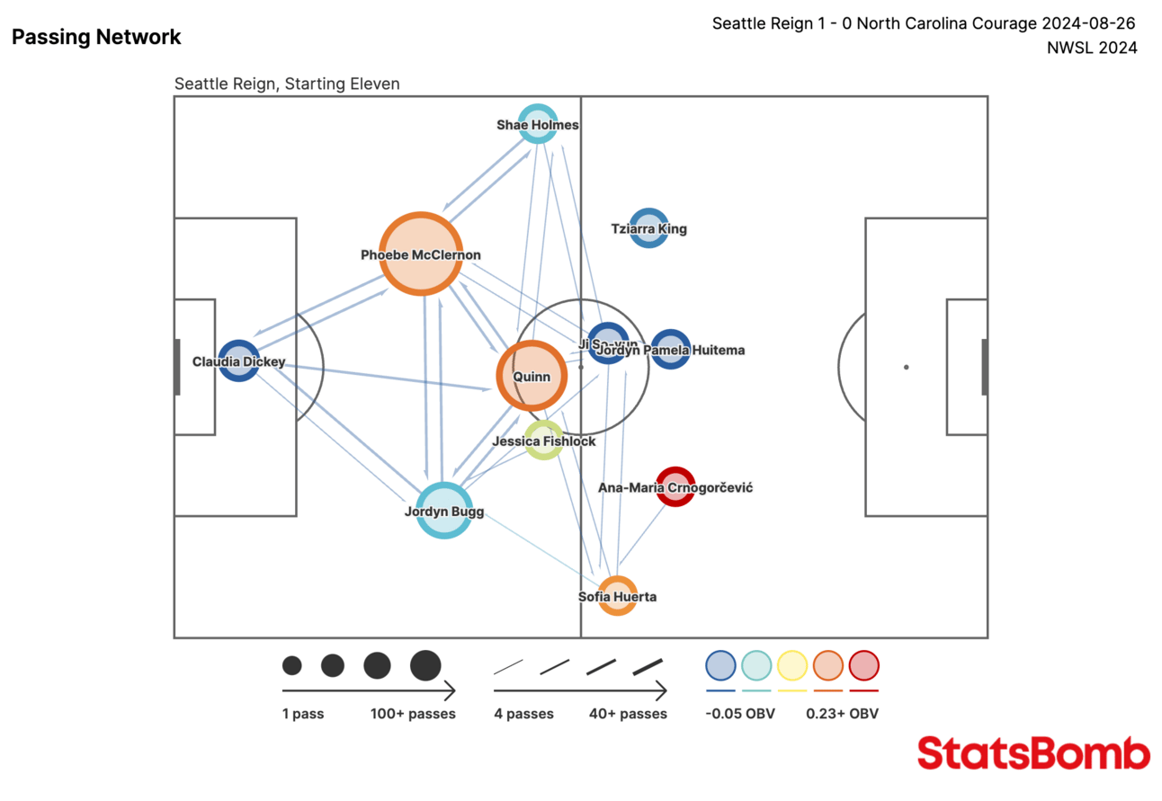 The Reign might be trying to break out of their StruggleBall™ nature a bit. This is still a bit squished, a telltale sign of Classic Harvs. The difference is that players on all three lines registered high pass OBV, which suggests they were at least trying effective forward passing things, and succeeding.