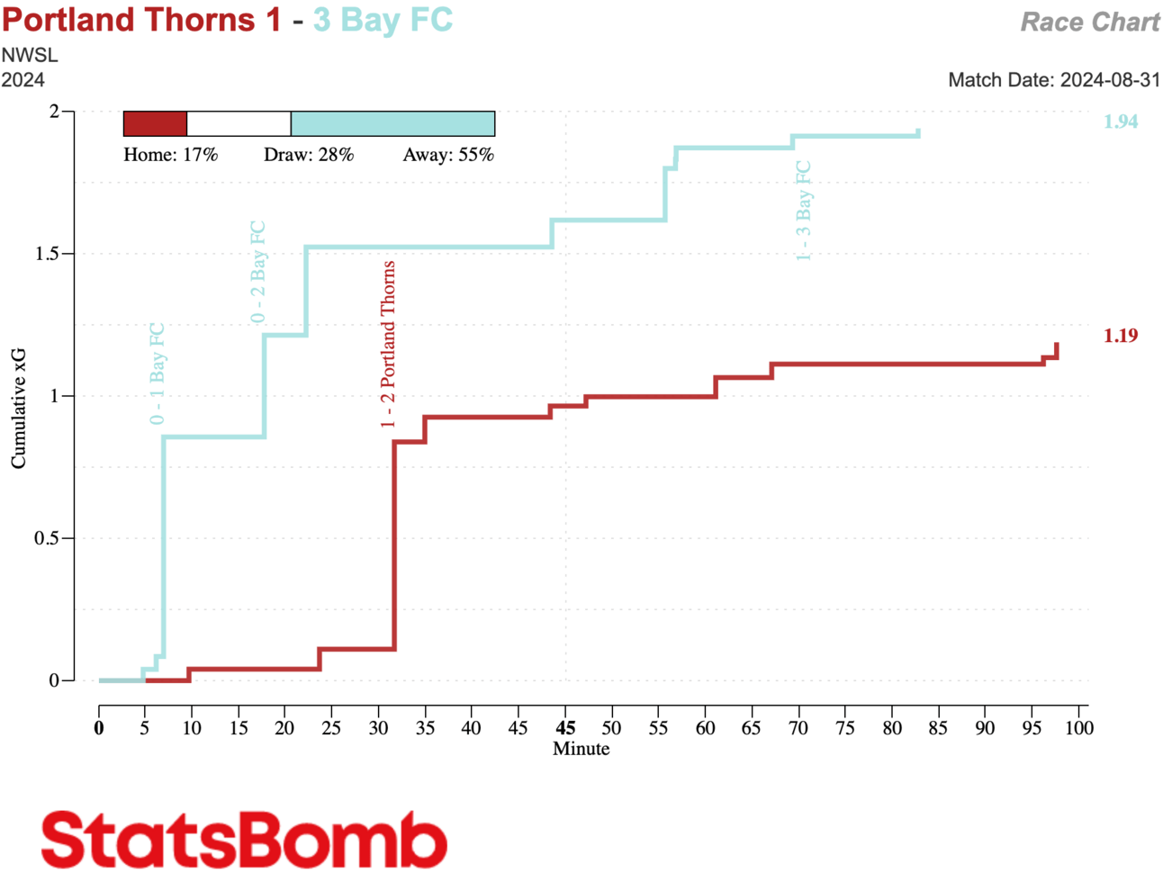 This was a win Bay definitely needed but is probably a bit of fool’s gold given how porous Portland’s defense and goalkeeping have been. And honestly I don’t even know how this worked against the Thorns. That giant hole between central defense and midfield should have been prime Sophia-Smith-Will-Haunt-Your-Every-Waking-Moment territory, but Bay somehow got away with it.