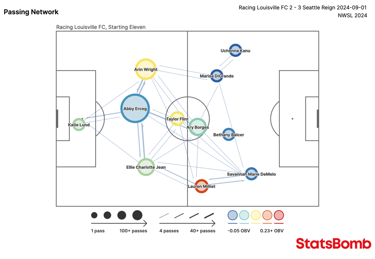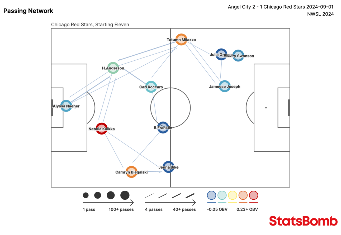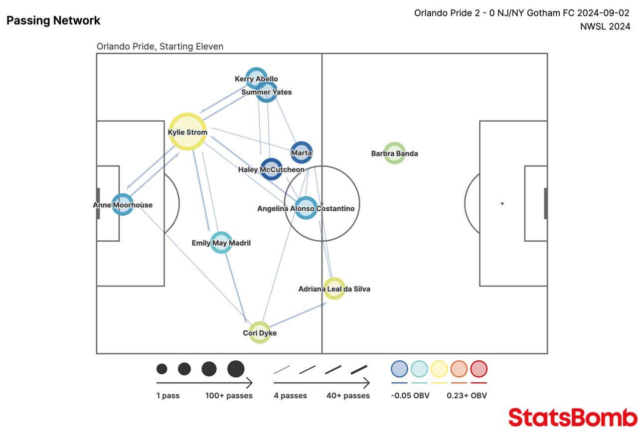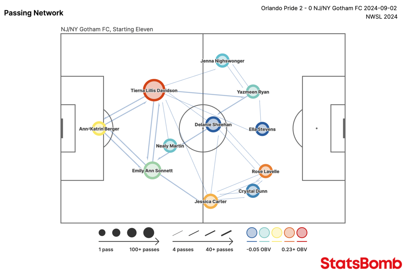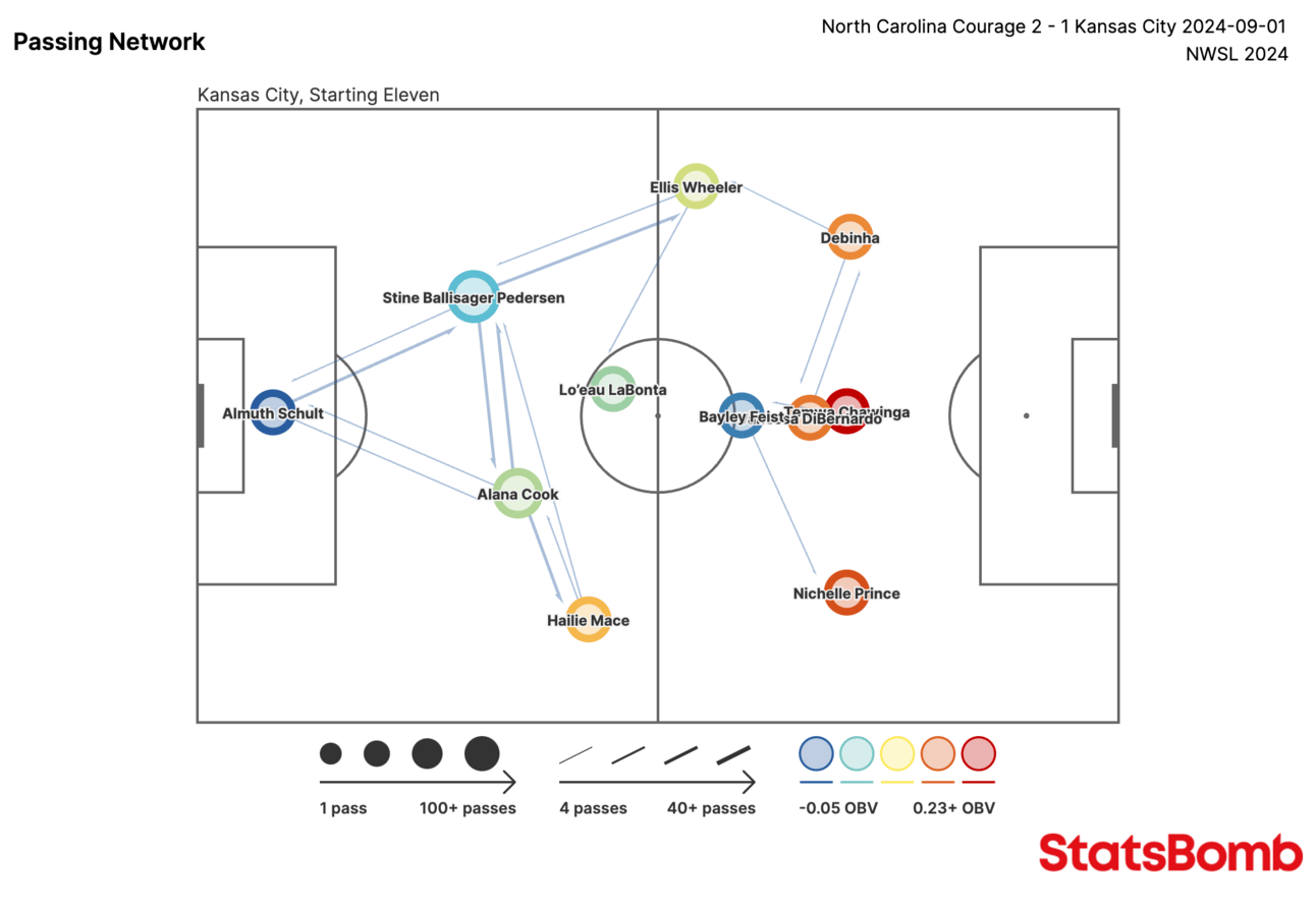 Their most dangerous players aren’t getting enough of the ball, and while Marisa DiGrande does a lot of good off ball work, on the ball there’s not much happening. She had twenty-two passes and the lowest—not just low, but negative—pass OBV among the starting XI (-.06). I’d like to see this with DeMelo back in midfield and Sears back on the right wing.
