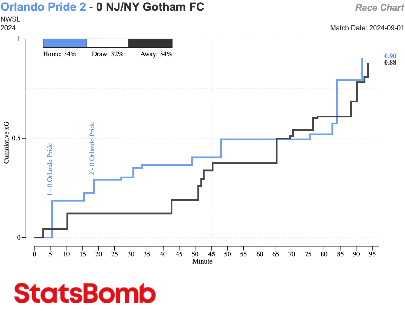 Gotham huffed and puffed and threw players forward but couldn’t find the right combo of passes to create the quality of shots we’re used to seeing from them. They sit right just below the league average (.10) with .09 xG per shot, which is usually fine considering the finishers they have in the squad. Orlando absorbed sixteen shots, but were able to cut Gotham’s xG per shot damn near in half, to .055.