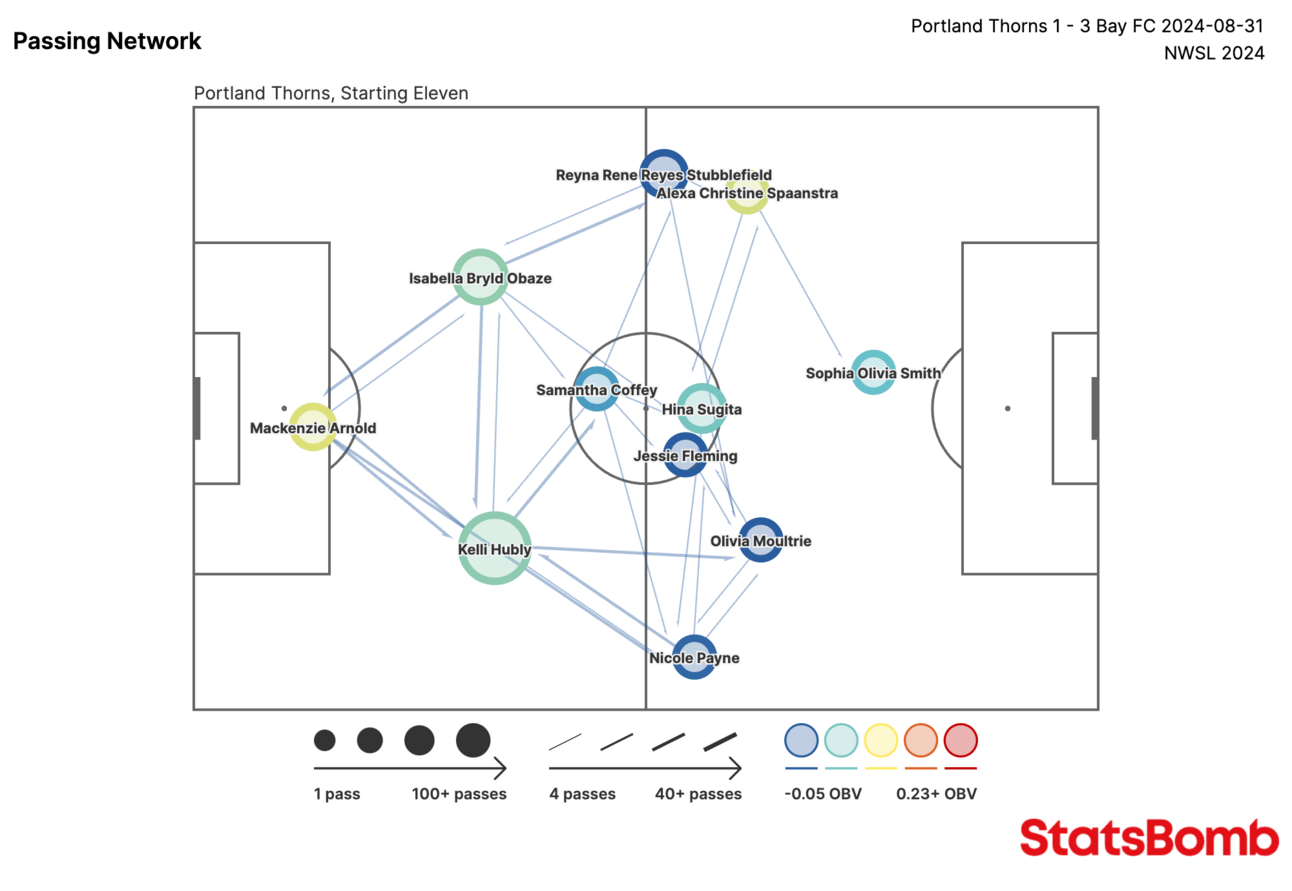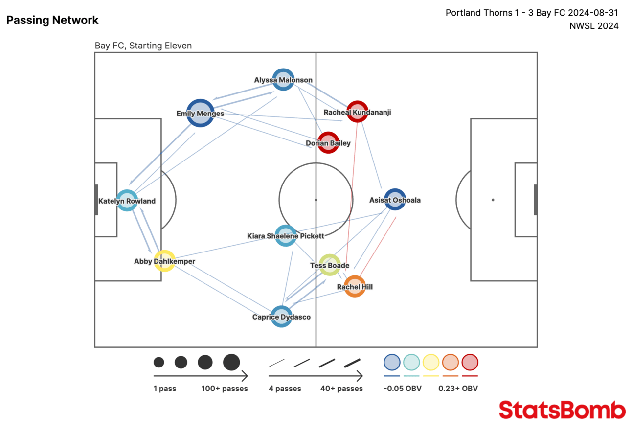 Bay tend to leave a lot of space to exploit in transition but not when you jumble players together in the center circle. Alexa Spaanstra did some good things, but this is a game where the Thorns missed Janine Beckie’s directness. Against a team now known for its defensive or midfield prowess, it’s quite shocking that Portland wasn’t able to get just five starting outfield players into positive pass OBV, and no one over .07 (and none of them were Sam Coffey).