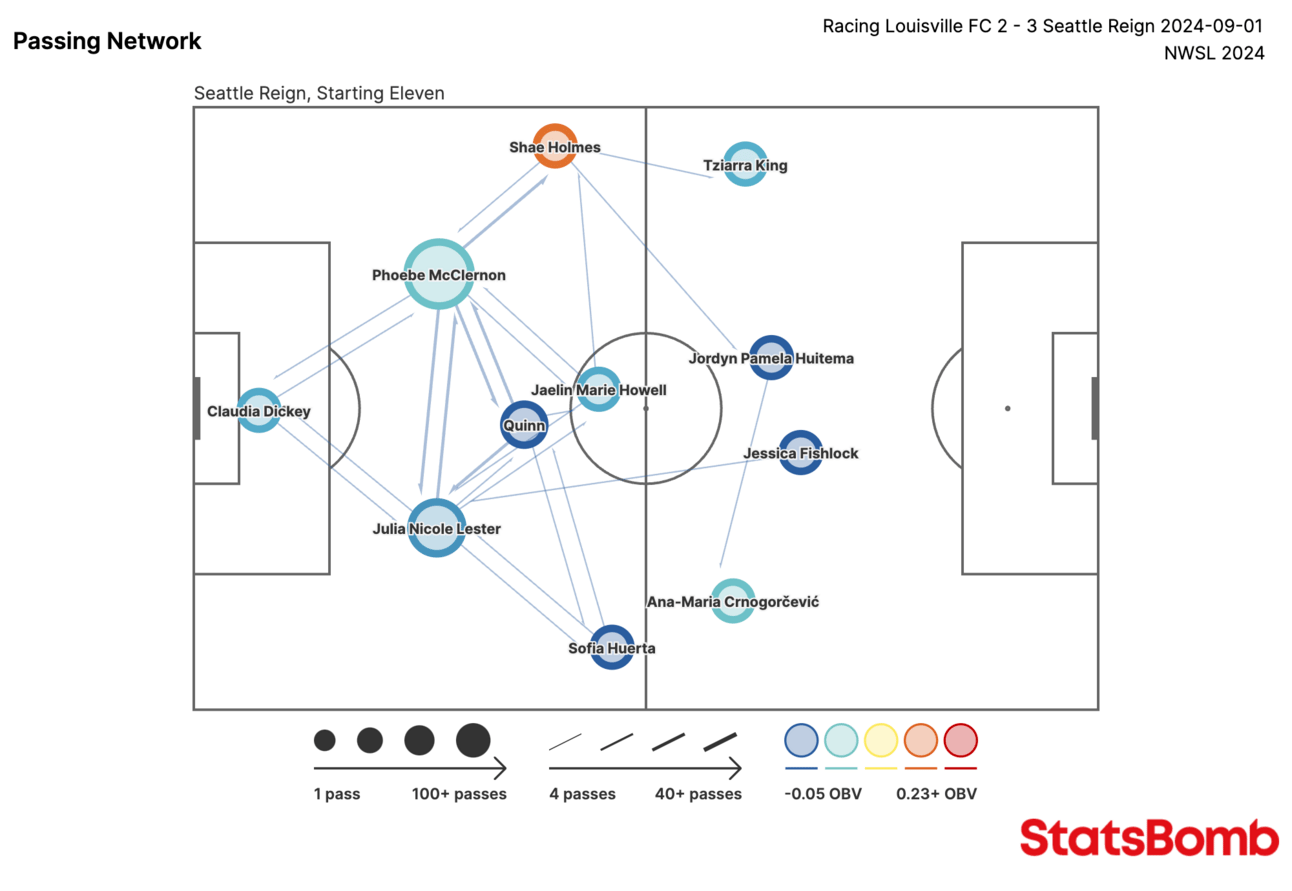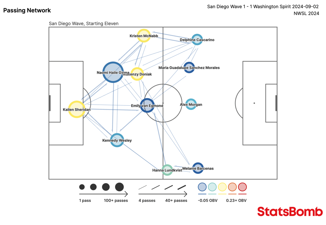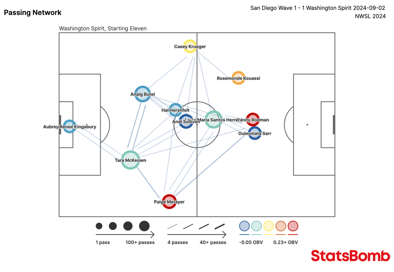 No real question about where the Spirit want to attack: straight down your mf’n throat. Rodman’s positioning is a bit of a lie since she just swapped sides and this is what happens when you do that. But she and Kouassi were inverting a lot to get closer to Sarr. Leicy Santos also struggled to find effective forward passes. Her 43 passes were second most among the starters, but she only managed .03 pass OBV. Meanwhile, Rodman hit .61 and Metayer dropped a .28.