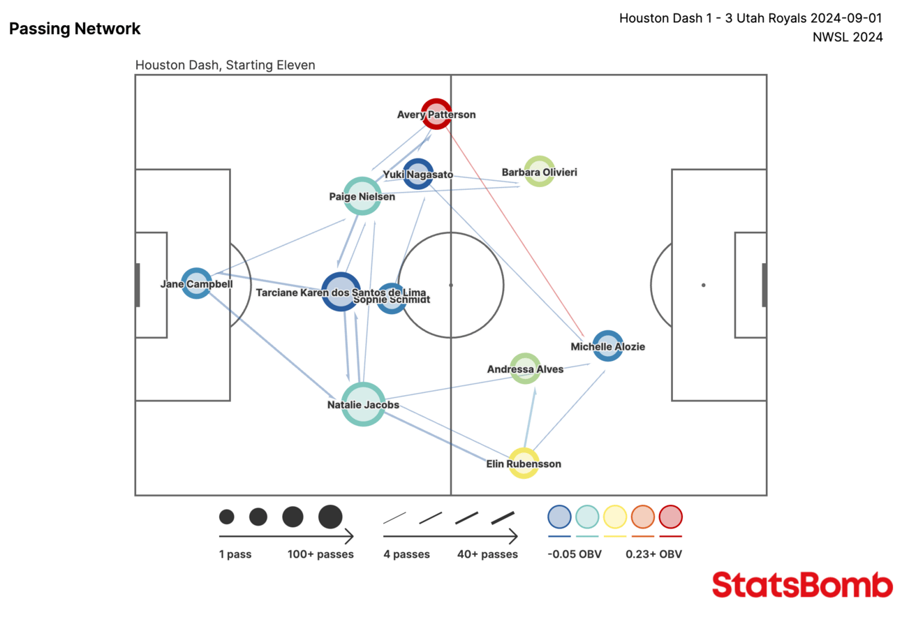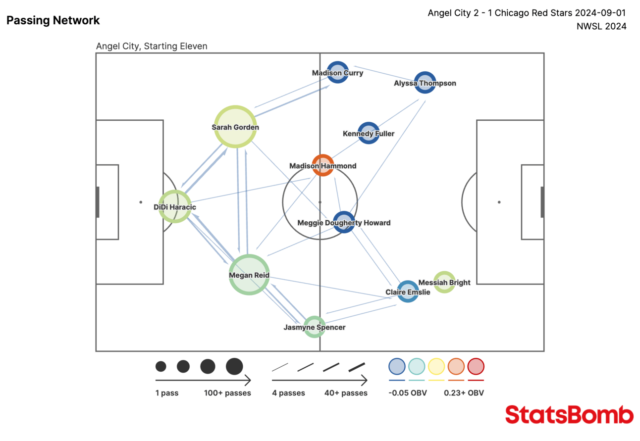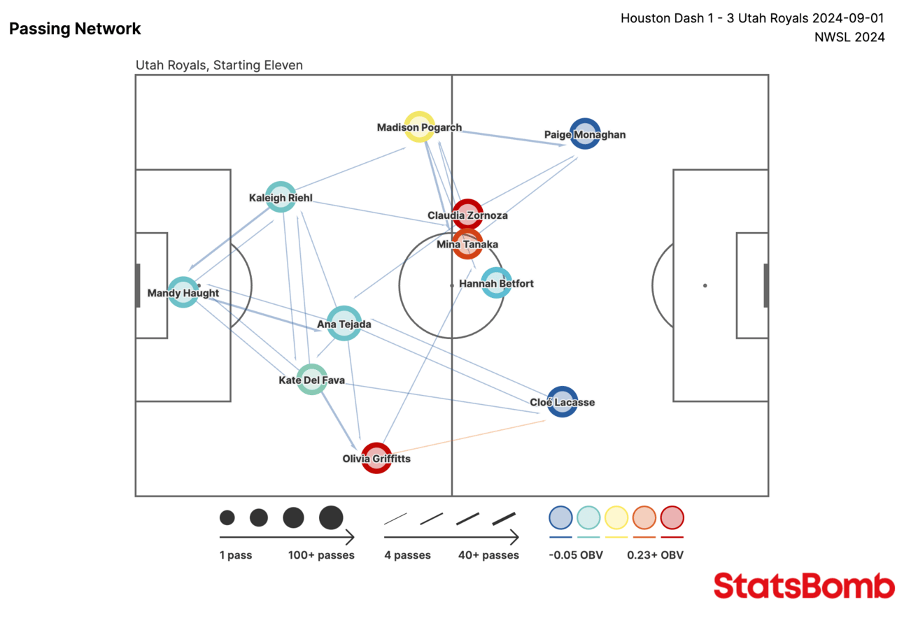 This is a bit chaotic but there are still strong connections and players have high pass OBV from areas you want to be able to effectively attack defenses. Not coincidentally, the two players in bright red near the center circle are new signings Claudia Zornoza and Mina Tanaka.