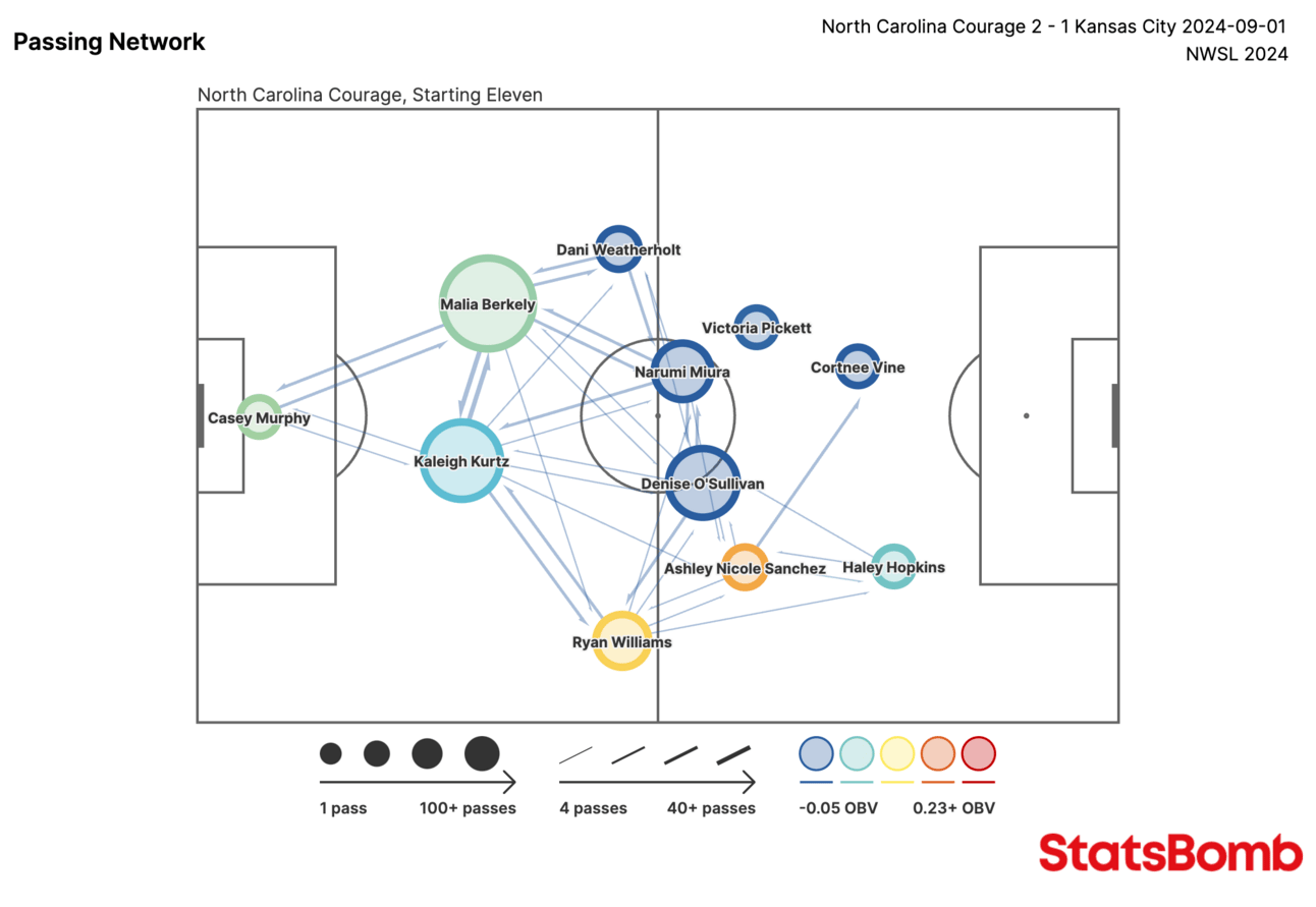 Considering the Courage are Barcelona at home and Bristol City away, this was not the game or pass network I expected from a game at WakeMed Soccer Park. The right side cooked a little bit—though more hot plate than Top Chef—while the rest of the squad struggled.