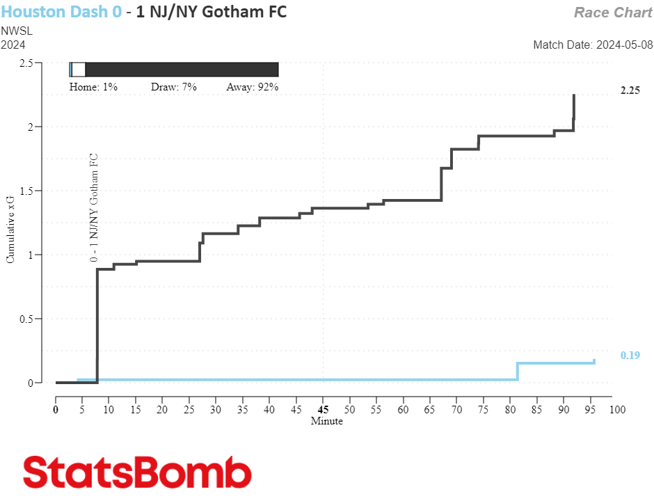 Gotham accepted the Dash’s invite to pour into their half and the good news is that they zipped the ball around and created 19 shots that totaled 2.25xG, the bad news is that they only scored one goal.