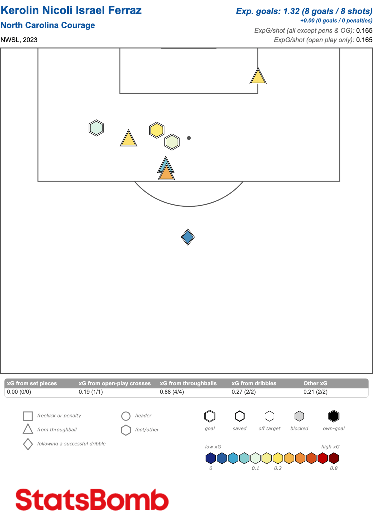 While only one was near/in the six-yard area, anytime you’re consistently shooting and scoring near the penalty spot defenses hate that shit, and the constant threat impacts games in your favor. In open play Kerolin scored eight goals from 4.53 xG (team scored 27 from 25.53 xG), so far this season the Courage have scored ten goals from 12.55 xG – and the underperformance is costing them points, and potentially playoff positioning.