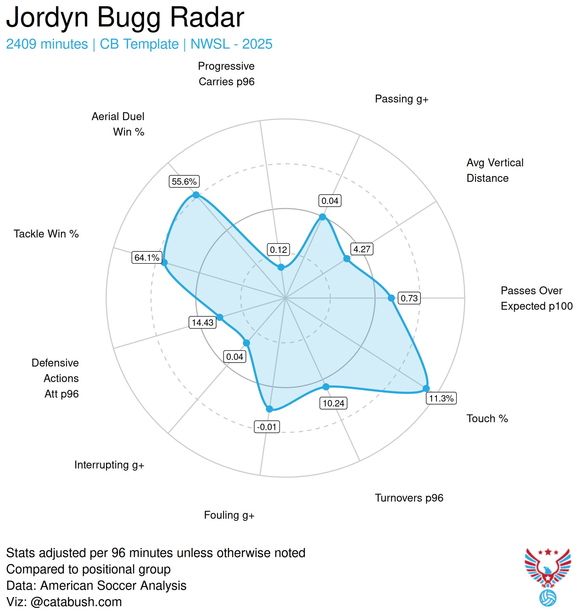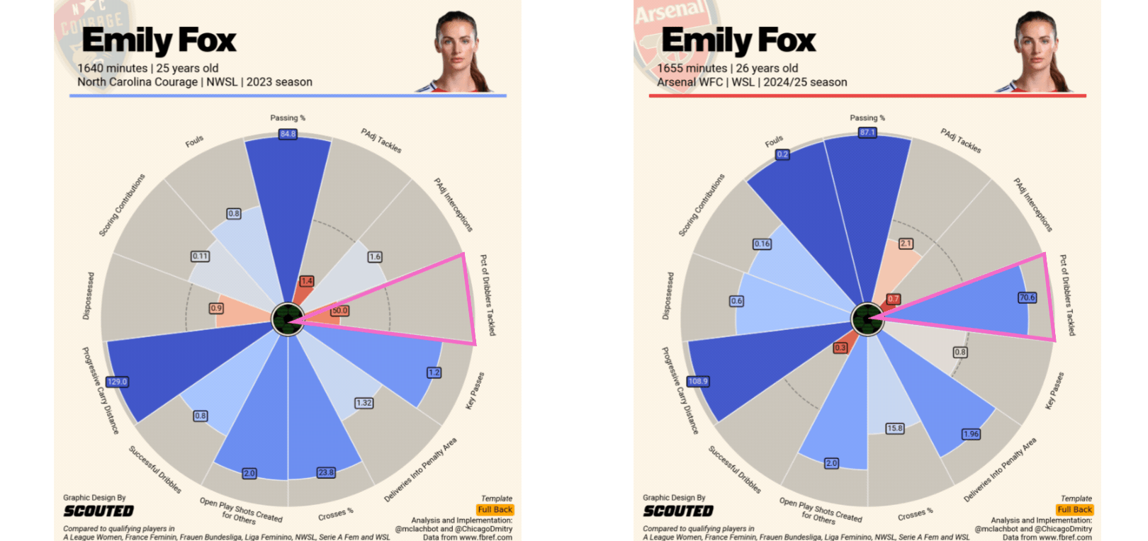 The difference in ‘Percentage of Dribblers Tackled’ reflects the variance in quality of attacking talent across both leagues, but it’s such a big jump that it can’t be just that. Fox has refined her positioning and timing in duels, and it’s helped grow her confidence and timing at the position.