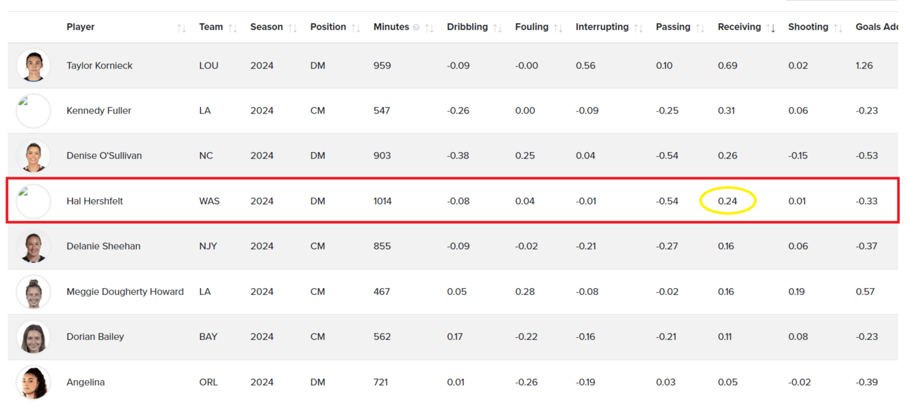 That is, until you stumble across a metric that measures how she receives the ball. According to American Soccer Analysis, which has a G+ metric that uses math and wizardry to compute the impact of receiving passes, Hershfelt is fourth among all midfielders (central and defensive). She’s accomplished this while also playing the most minutes.