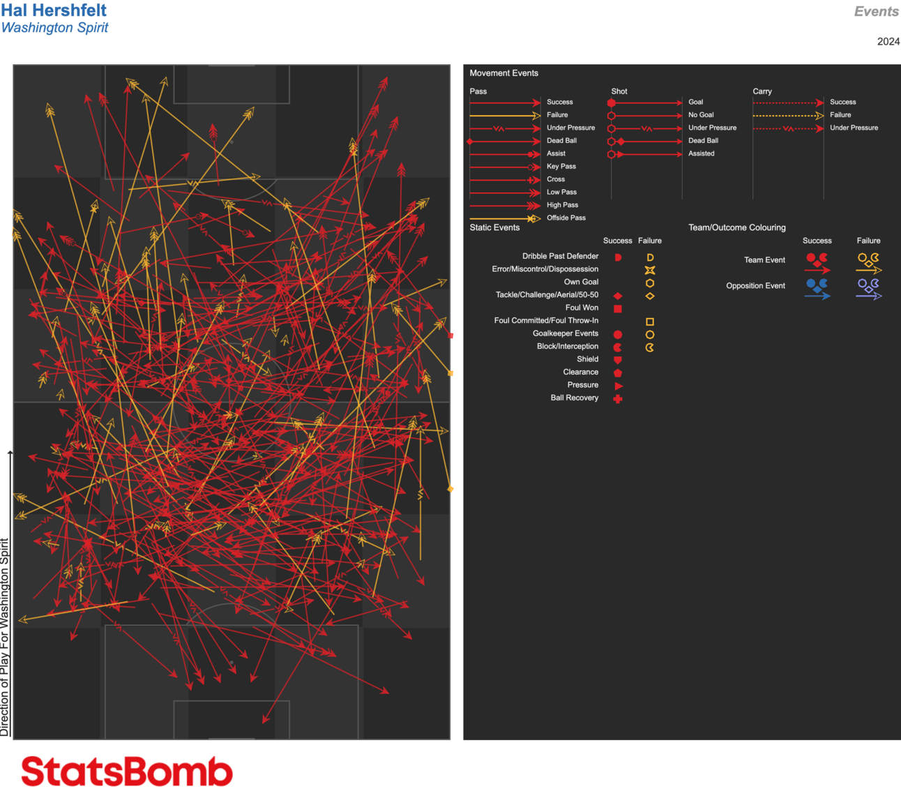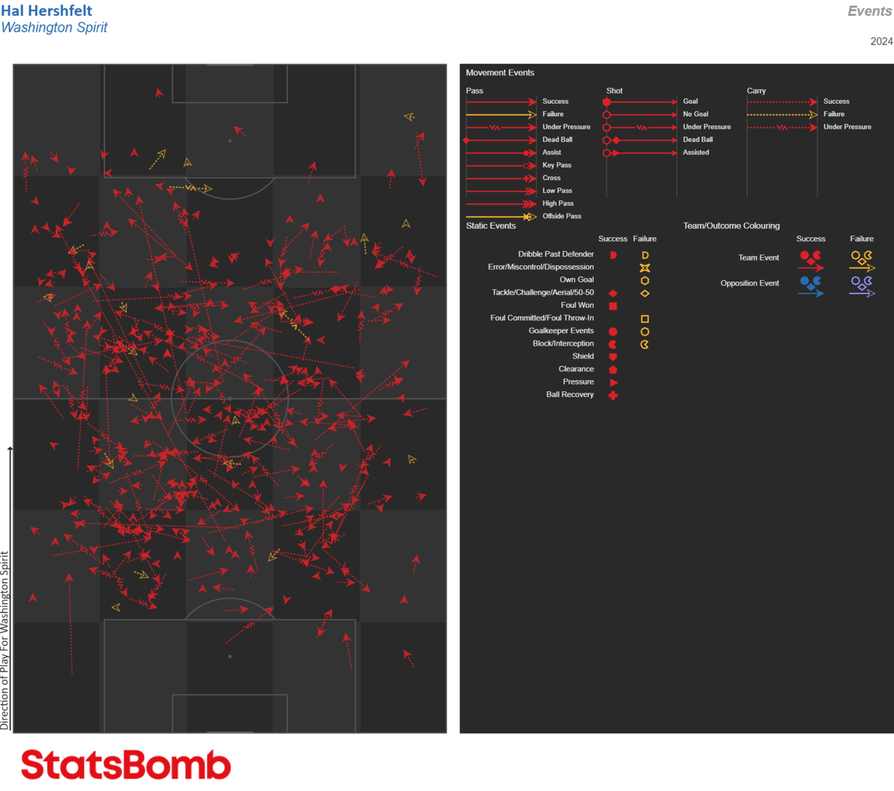 Hershfelt has also completed 80% of her attempted passes so far, a number that is top-7 among all midfielders, and second among midfielders who’ve played more than 1,000 minutes (Coffey, 84). What makes this even more impressive is that she has the third highest percentage of passes under pressure, with 25% of her passes coming while being pressed by an opponent.