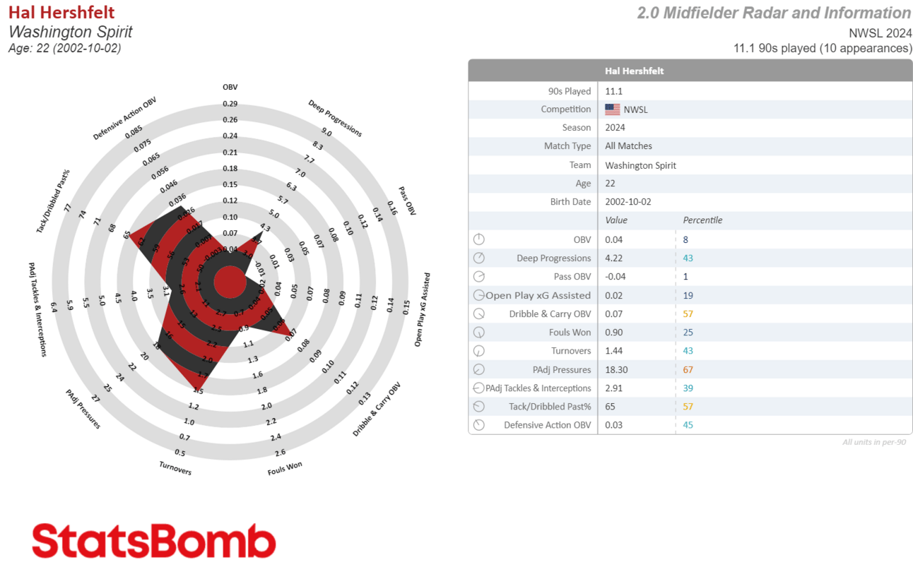 Looking at the above visual makes this next bit unsurprising, but key to note. Hershfelt leads all midfielders with the longest average length of successful passes under pressure, 18.9m (20.6 yards). It’s a terrific skill that doesn’t pop or show up in highlights, even extended ones. But her style of play has been key to her college team, and pro club as well.
